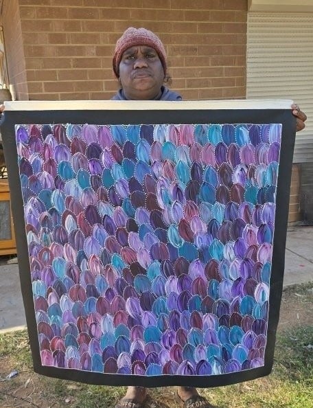 Alvira’s paintings are characterised by fine detail, intricate dot work, and a strong sense of rhythm — all echoing the knowledge, ceremony, and connection to Country passed down through her family.