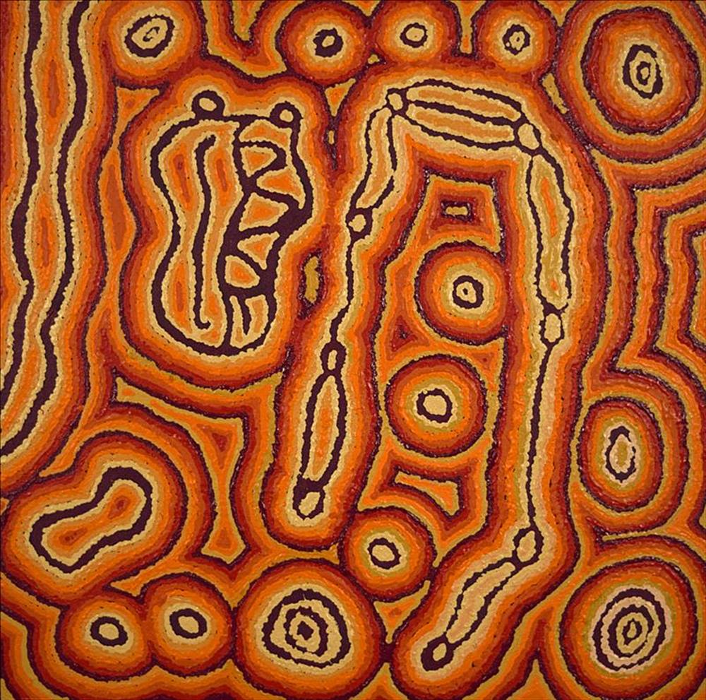 The subject of this work is Lappi Lappi, a rockhole near Lake Hazlett, about 90km northwest of Lake Mackay in Western Australia. Located in a sheltered basin, the rock hole at Lappi Lappi is a permanent source of water, and is surrounded by country rich in bush tucker.