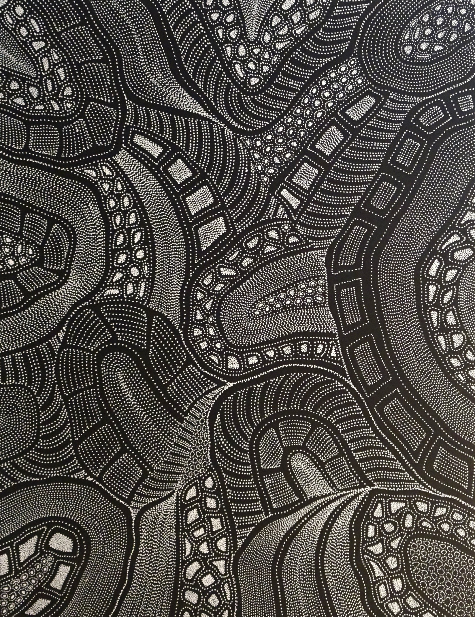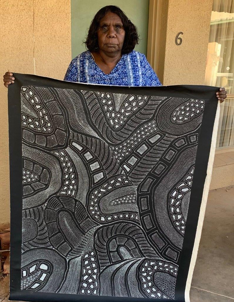 This outstanding artwork depicts from a topographical view in fine detail, multi layered elements associated with Anna’s homelands of Atneltyeye, Utopia in Central Australia. The illustration is important visually and spiritually of country – sand hills, river beds and significant landmarks for ceremonies. This is often done in groups so that knowledge is passed down from older to younger women. Ceremonial sites are where the women gather for girls’ initiation and other cultural Law matters. The women sit around the waterholes, with the waterholes being full in the dry desert land. Due to this, there was plenty of bush tucker around for the women to eat during the sometimes very long period of time they camped out for Women’s Business.