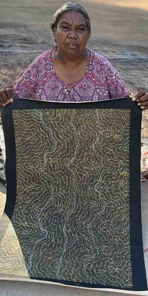 Annie started her artistic career with wood carvings and beautiful jewellery, beginning painting in early 2000. She often depicts motifs in her artworks that are typical for paintings from Central Australia including the Bush Plum (Seeds), Bush Bean and Bush Berries Dreaming or Women’s Ceremony (Awelye).