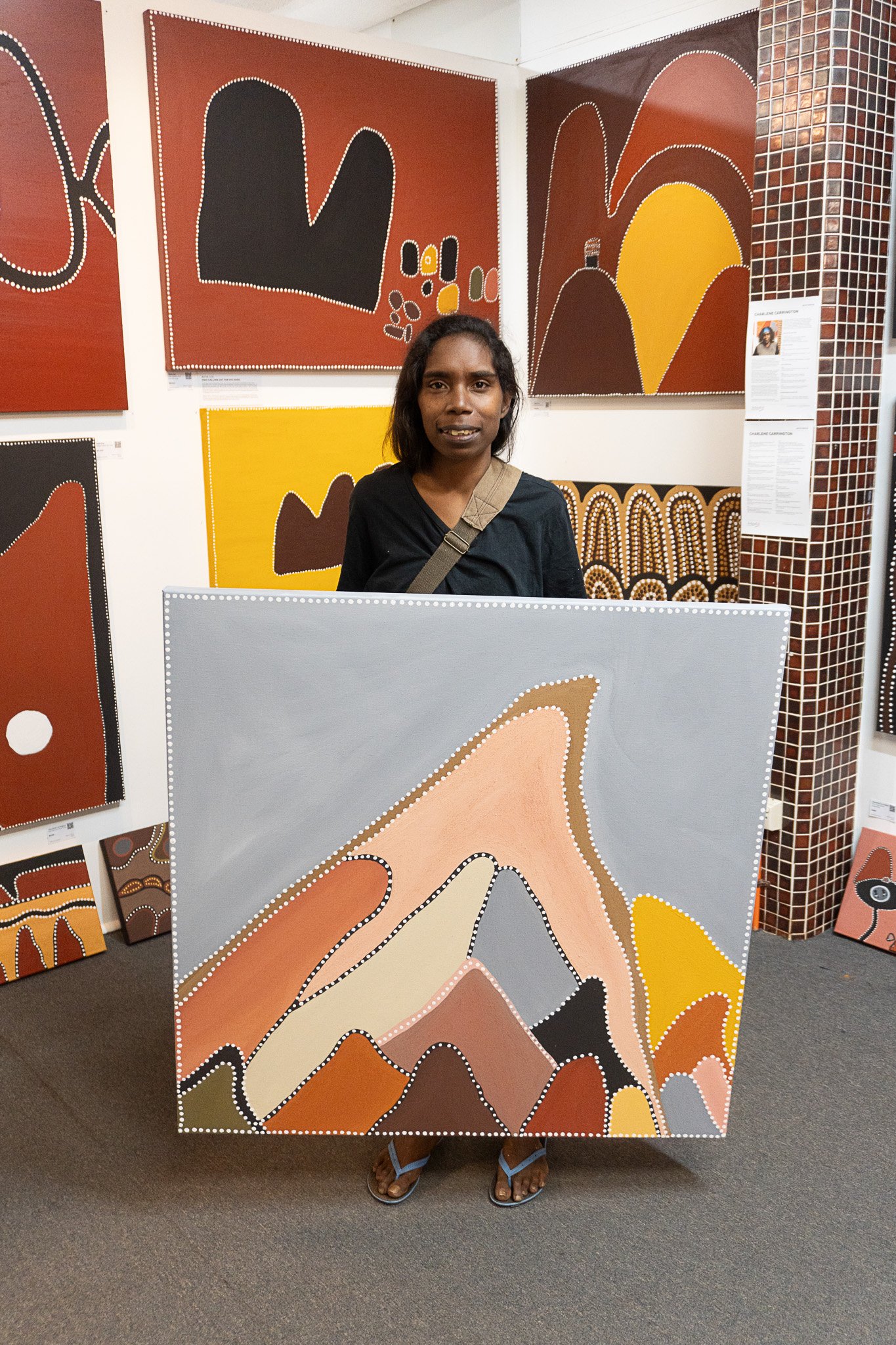 April is the youngest artist from one of the most talented families of Ochre Painters in the East Kimberley. Her late great-grandmother Betty Carrington commenced painting late in life but was an established Senior artist; her Ganggayi (grandmother) Sade Carrington is an International Artist; her mother Charlene Carrington is one of the most outstanding of the Third Generation ochre artists. Her late grandfather Churchill Cann was known throughout the world and his paintings are included in the most important private and corporate collections. Her great-grandfather was Beerbee Mungnari, also of International standing and the last of the Elder Ochre Artists who painted with the likes of Rover Thomas, Jack Britten, Paddy Jampinji and George Mung Mung. April now forms the fourth generation of talented artists in her family.