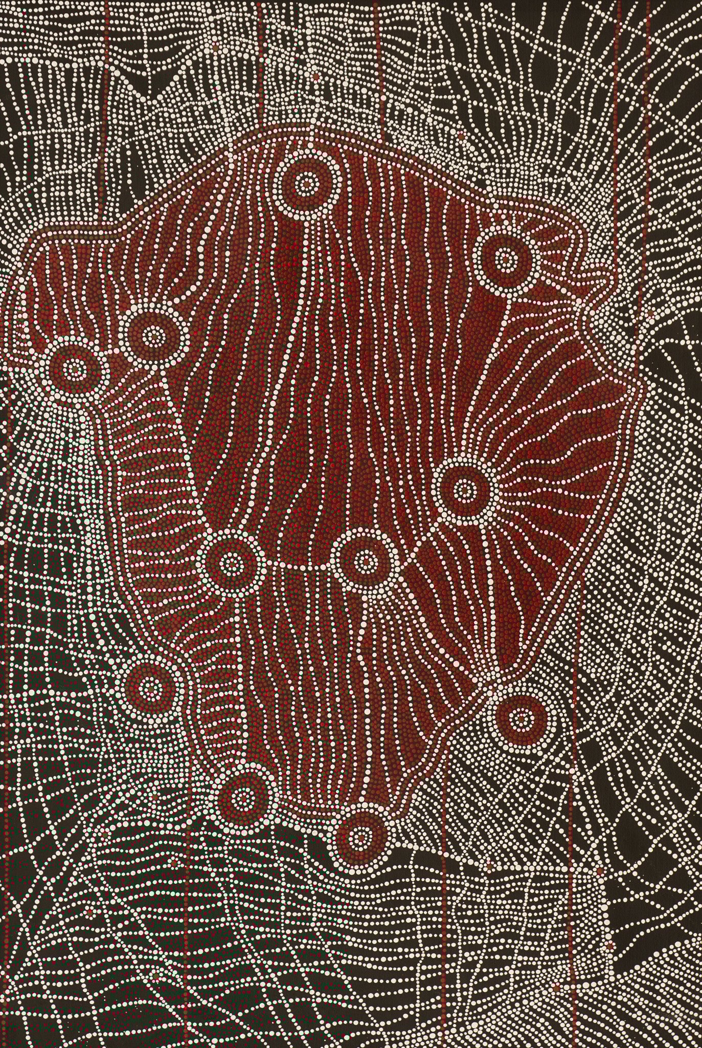 ‘Black Soil’ comes from Gamilaraay Country which is at the top of NSW. The black soil there is one of the richest agricultural soils in Australia. It also has strong cultural connections with our ceremonies taking place on it, my family is buried in it and now I paint it with each element that makes it home. I come from a strong matriarchal line which is shown in this painting.