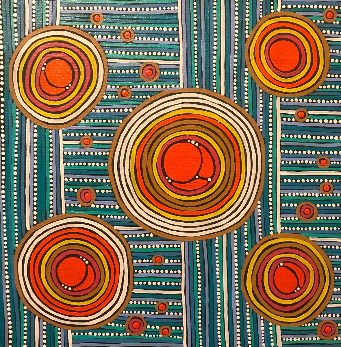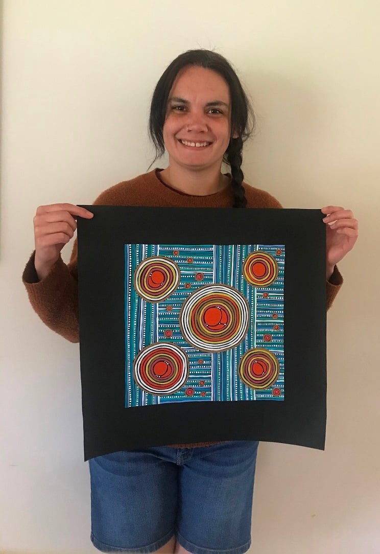 Painting with acrylic allows Arkeria to use a range of colours which represents her Country, the stories and the knowledge. Her grandfather, Don Briggs, a Yorta Yorta Elder is another person who strongly influences her. Don is also an artist and he has taken on a mentoring role with her as well as supporting her to have confidence to paint “her way”. She loves how art has allowed her to express herself, and believes art is a healing force that connects past and present.