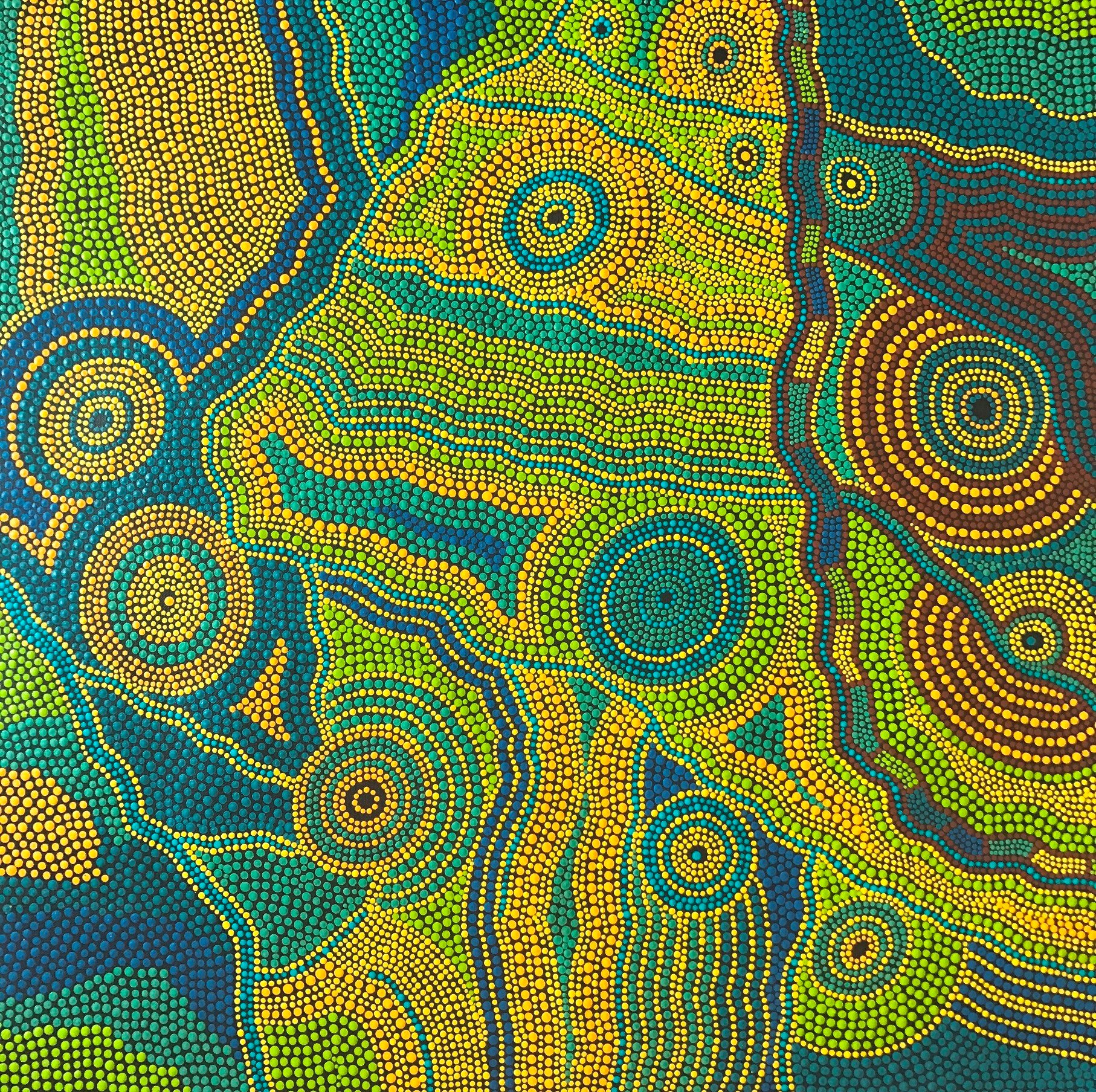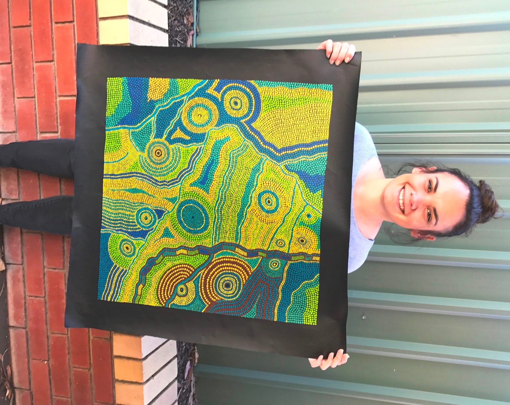 Painting with acrylic allows Arkeria to use a range of colours which represents her Country, the stories and the knowledge. Her grandfather, Don Briggs, a Yorta Yorta Elder is another person who strongly influences her. Don is also an artist and he has taken on a mentoring role with her as well as supporting her to have confidence to paint “her way”. She loves how art has allowed her to express herself, and believes art is a healing force that connects past and present.
