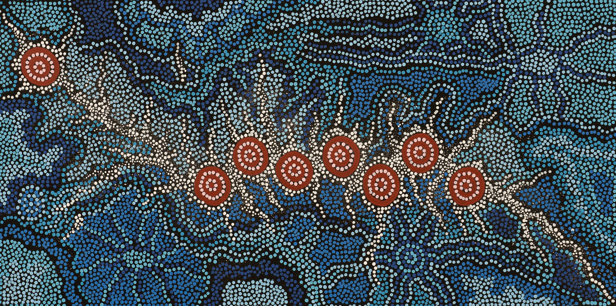 Azeza learnt to paint by observing and assisting her mother. Her art is colourful and dramatic in style, depicting the dreaming stories and women’s ceremonial activities of her paternal great-grandmother Long Rose Nungala, combined with the bold and precise imaging of her grandfather, aunty and mothers artworks.