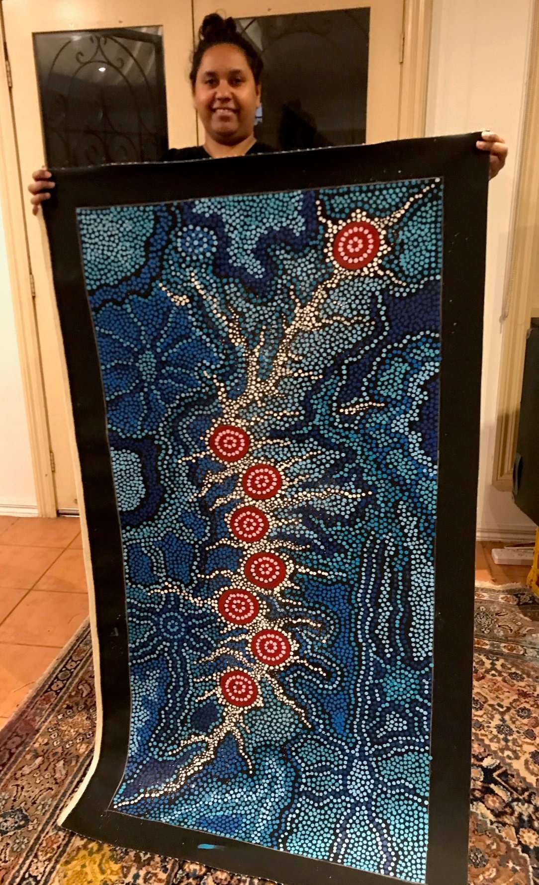 Azeza Possum was born in Kempsey, NSW in November 1995. She is the granddaughter of Clifford Possum Tjapaltjairri, AO (c. 1937 – 2002), Australia’s most celebrated Aboriginal artist. Clifford’s art hangs in all of the major collections and museums worldwide, he presented his art to the Queen, and features in numerous important publications on the Masters of Australian Art.