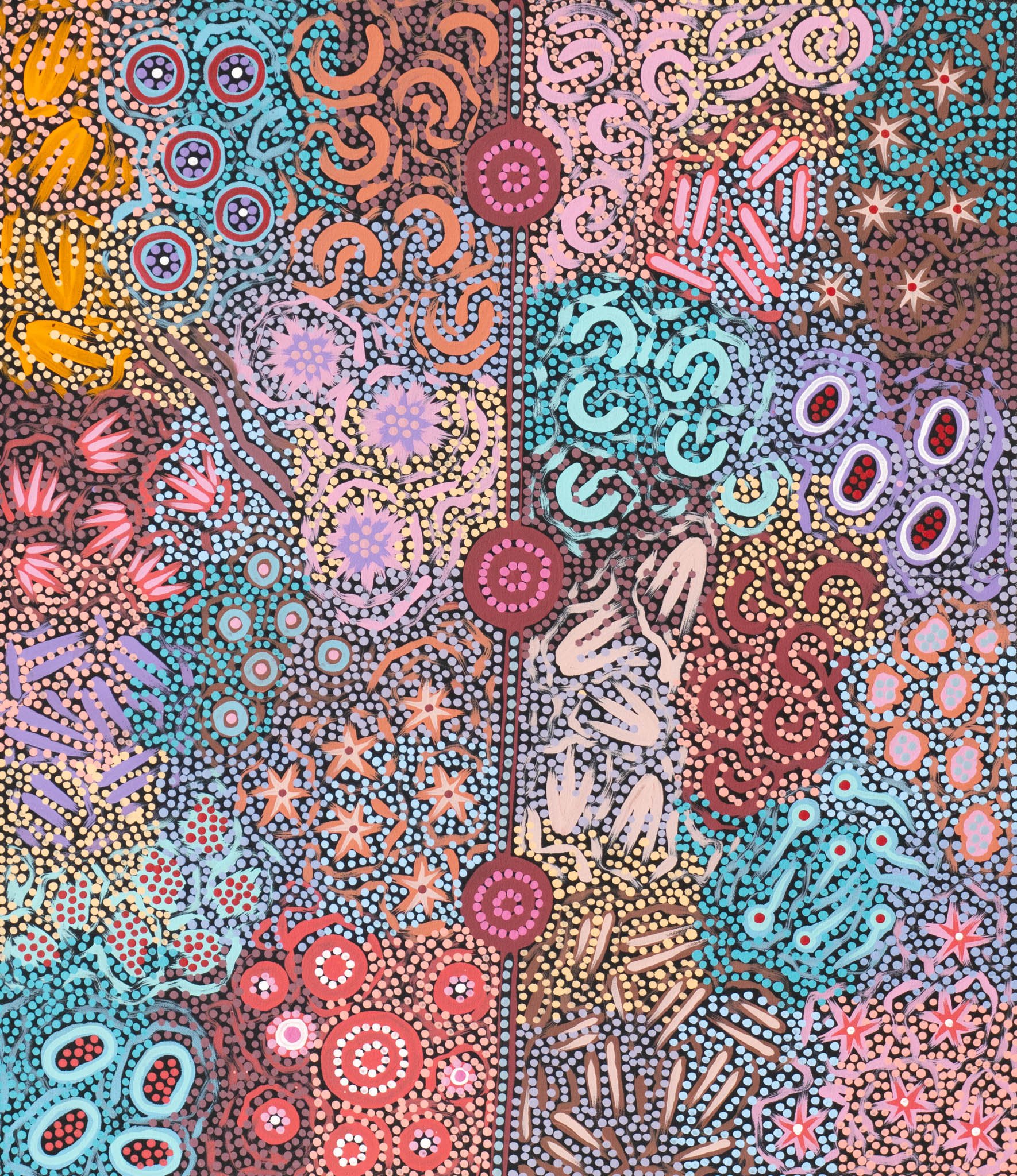 Azeza learnt to paint by observing and assisting her mother. Her art is colourful and dramatic in style, depicting the dreaming stories and women’s ceremonial activities of her paternal great-grandmother Long Rose Nungala, combined with the bold and precise imaging of her grandfather, aunty and mothers artworks.