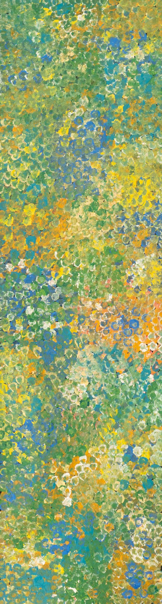 This artwork depicts the Bush Plum (or Conkerberry). Belinda’s grandmother, Polly Ngale, is the senior custodian of the Bush Plum Dreaming. The varying composition in colour and pattern reveals the geography of the Bush plum, as well as the artist’s knowledge of significant places, such as clay-pans, soakages and spinifex mounds. Bush Plum is a food source for the Aboriginal people from Utopia in the Eastern desert of Central Australia. The women pay homage through body paint, songlines and dance cycles in their ceremonies.