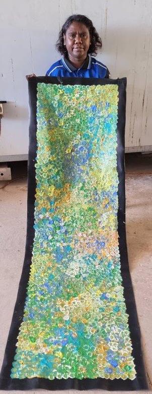Belinda paints the Bush Plum Dreaming story that she inherits from her grandmother Polly Ngale. Her technique is to render the many colours of the bush plum plant as the fruits ripen. The bush plum is known as anwekety and only fruits for a few weeks of the year.