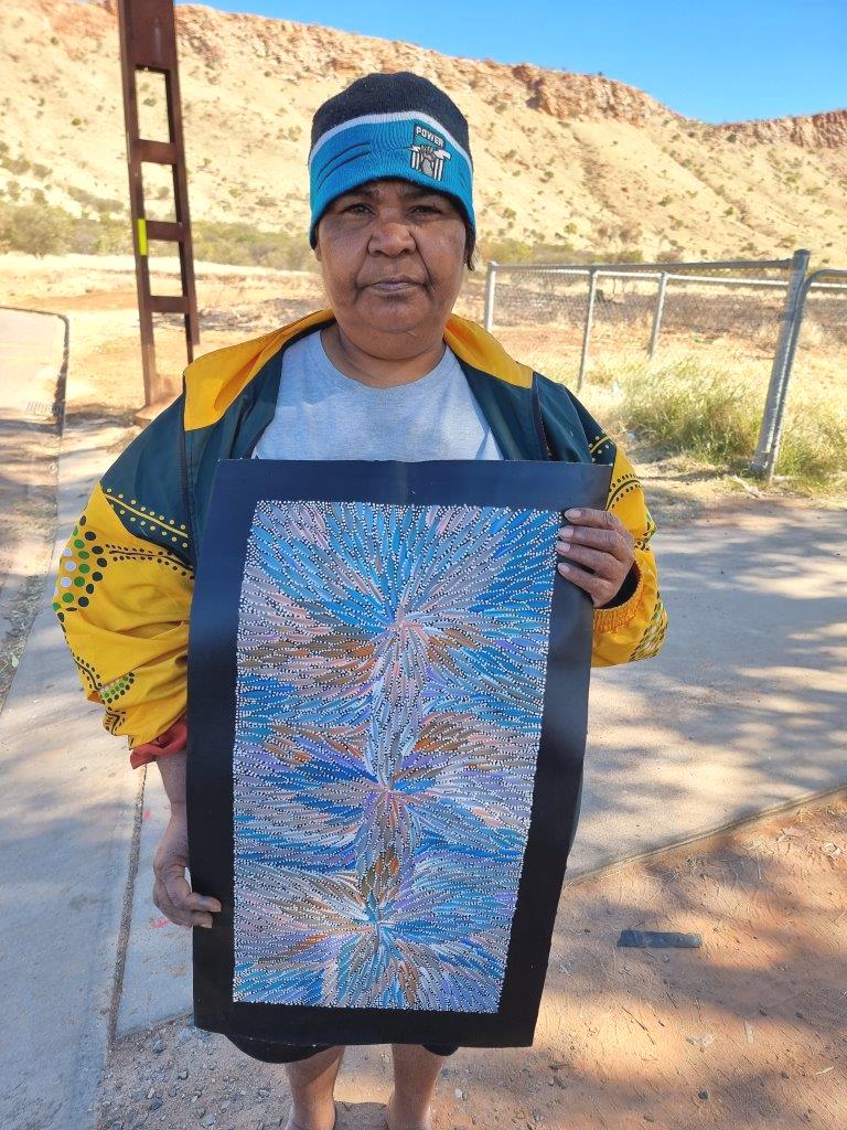 Bernadine comes from a family of famous artists including Abie Loy and Josie Petrick Kemarre that have emerged from the Utopia area in the NT. Her sister-in-law is Anna Price Petyarre, one of the most sort after Central Desert artists. She learnt from a young age the art of painting her dreamings, ceremonies and important bush foods onto canvas.