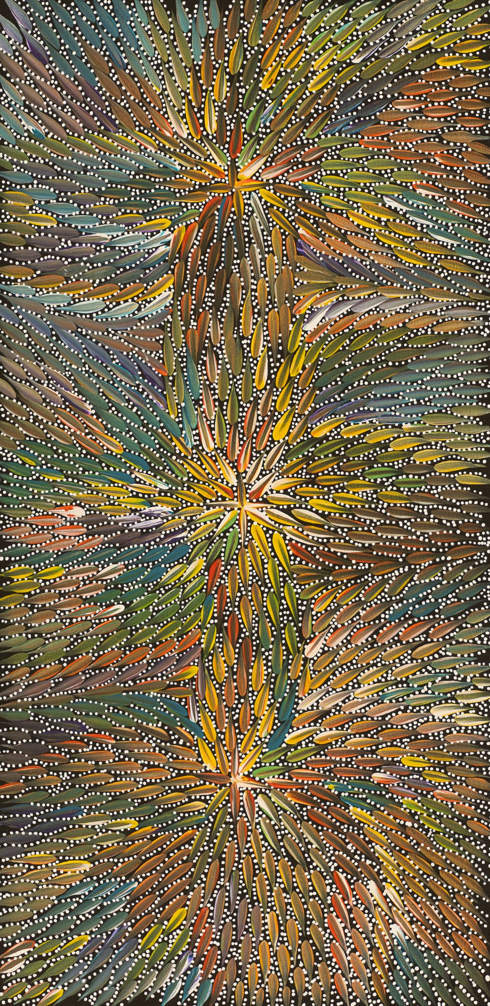 Bernadine has painted the Desert Yam (or Bush Plum) story from her family’s country. The yam grows underground with its viny shrub growing above ground up to one metre high. It is normally found on Spinifex sand plains and produces large flowers after summer rain. The yam tastes much like the common sweet potato. It can be eaten raw or cooked and is still a staple food for the desert aborigines where it can be harvested at any time of the year. It is also renowned for its medicinal properties. This medicine is used to heal cuts, wounds, bites, rashes and as an insect repellent. In this painting, Bernadine depicts the leaves and flowers of the yam paying homage to the spirit of this special plant in the hope that it will regenerate.