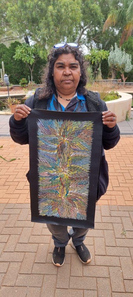Bernadine currently lives with her husband Steven and their children on Napperby Station, NT. Her artworks are intricate and colourful and she is an artist sure to succeed.