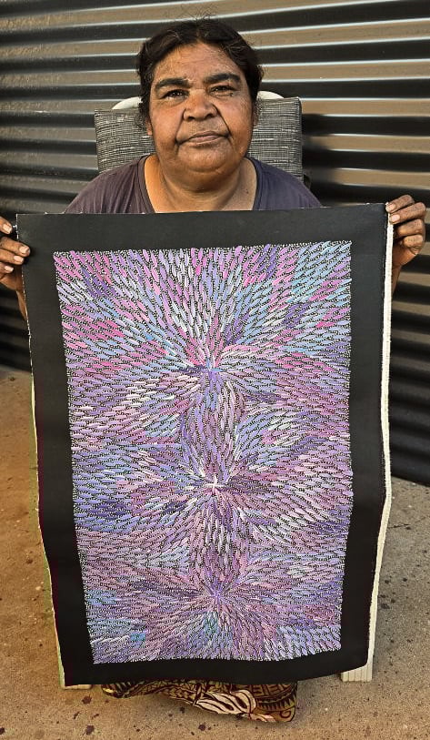 Bernadine has painted the Desert Yam (or Bush Plum) story from her family’s country.