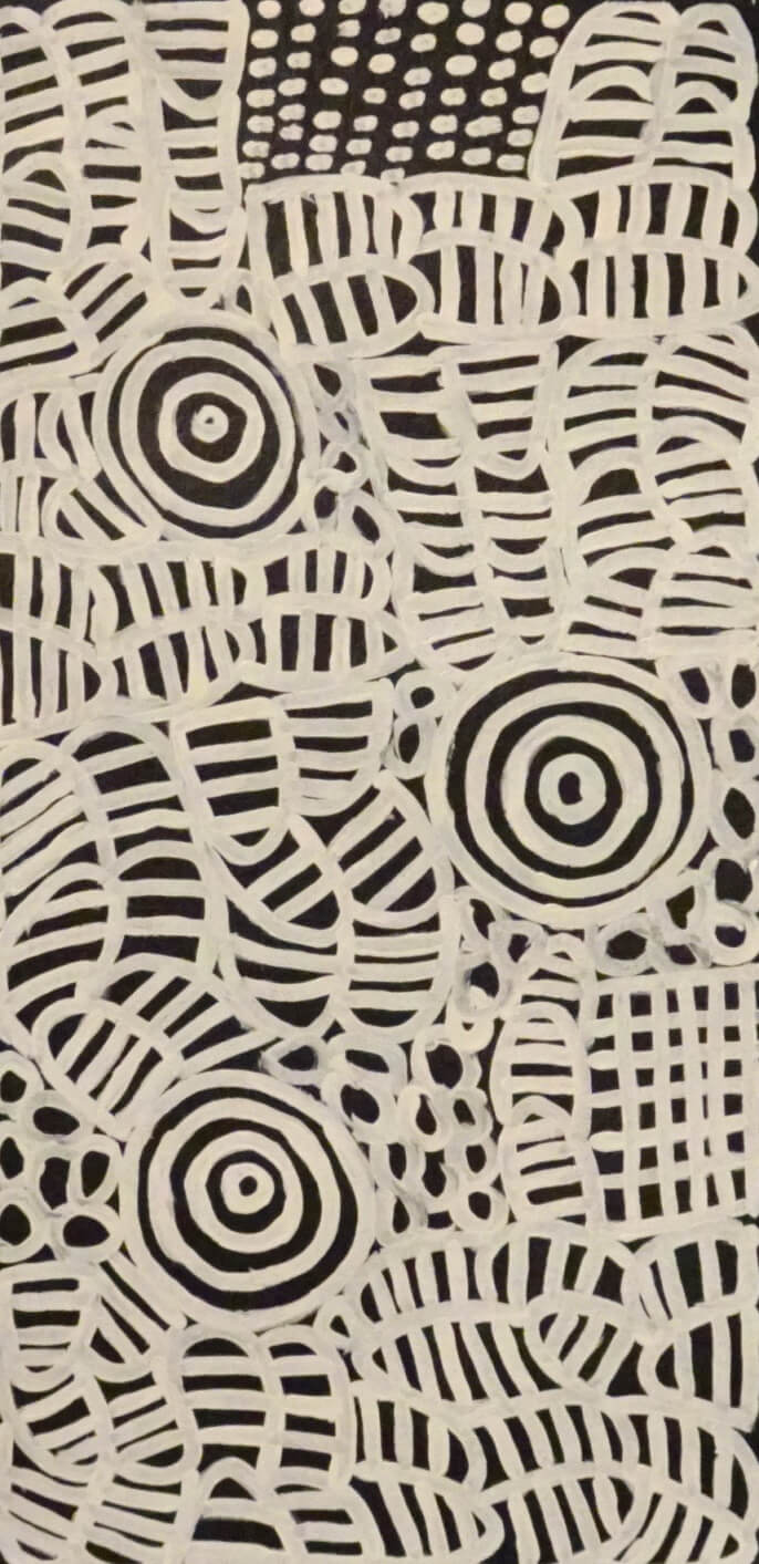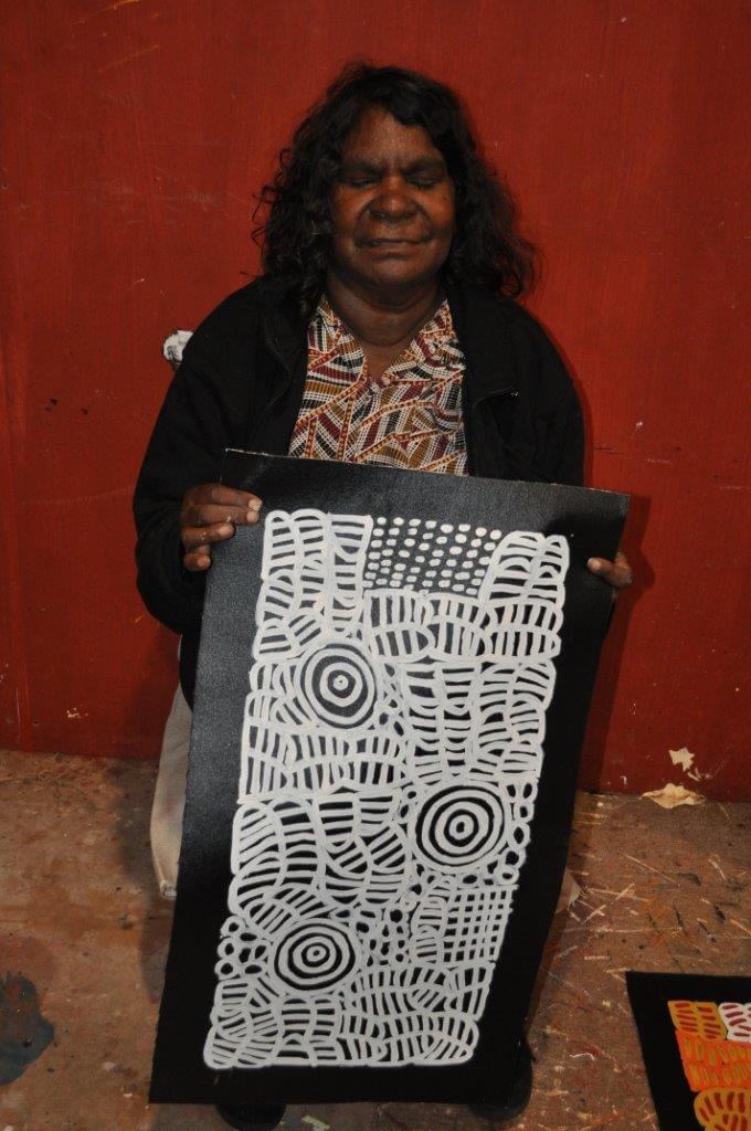 Though Betty enjoys using lots of different colours in her paintings, the traditional colours used during ceremony for her dreaming stories from Atnwengerrp country are red and white. Atnwengerrp lies in the heartland of Alyawarr country, about 200 kilometres to the north-east of Alice Springs.