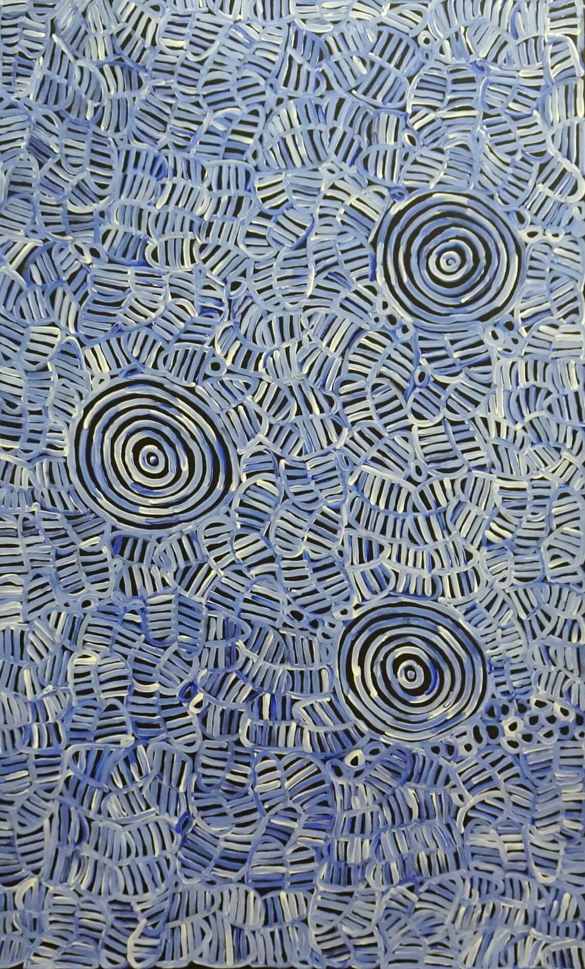 The bold patterns throughout Betty’s painting illustrate women’s ceremonial body paint design. The large roundels depict the waterholes around which the women perform ceremony and the small circles are the bush melons, representing the bush tucker that they live on whilst the ceremonies are taking place, which often take up to week. The women apply the body paint designs onto their breasts, arms and thighs singing as each woman takes their turn to be ‘painted up’. Their songs relate to the dreaming stories of ancestral travel and other totemic plants, animals and natural forces. Awelye – women’s ceremony, demonstrates respect for the land. In performing these ceremonies they ensure well-being and happiness within their communities.