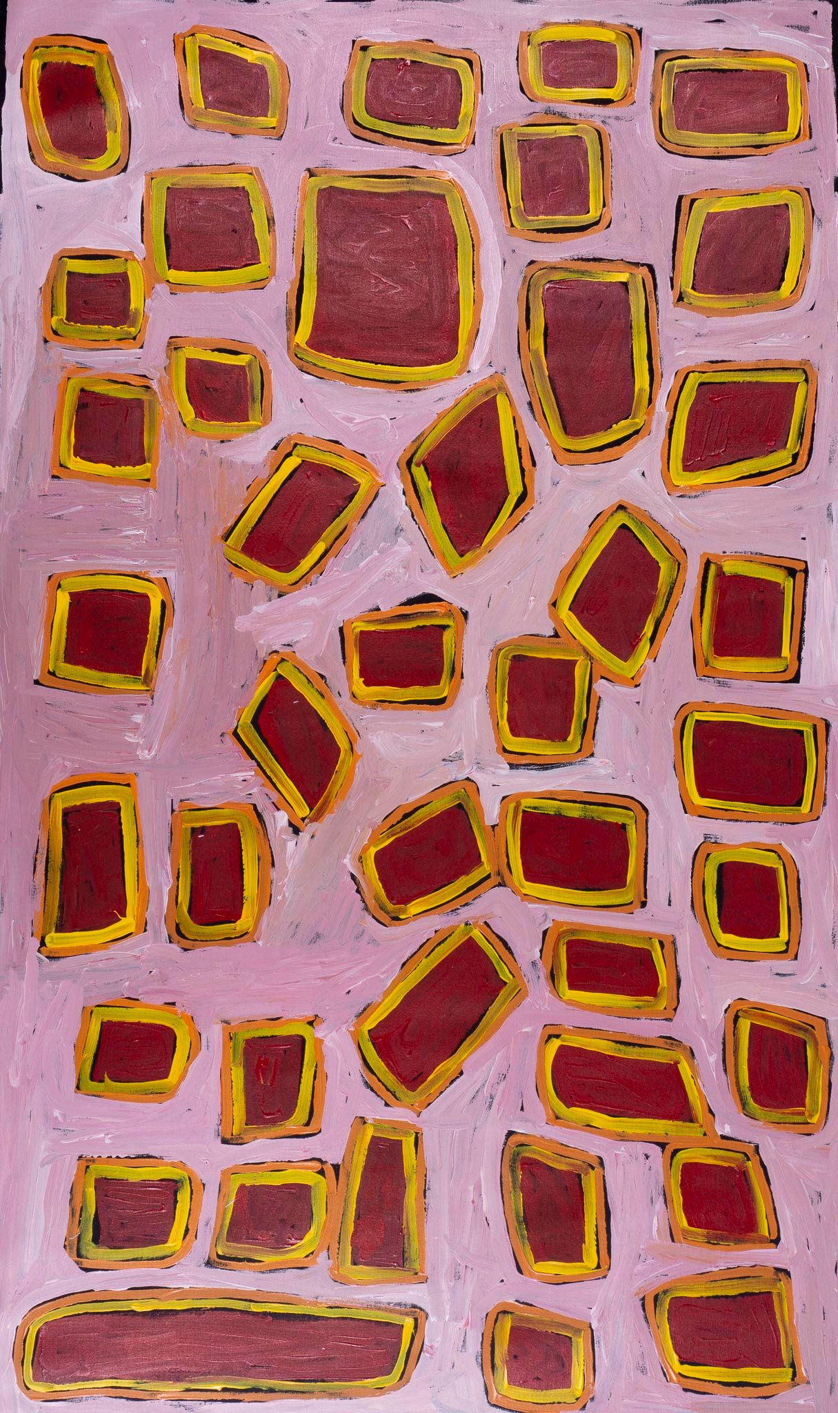 A series of concentric squares pulsate with the searing heat of the Western Desert, the colours meld and overlap, creating a transparency of paint that flutters across the ground of the painting. These are the designs of the Tingari ceremony – secret men’s business that takes place near the remote community of Tjukurla on the edge of Lake Hopkins. Each square or circle is roughly painted, revealing the artist’s hand as it moves with an intensity across the canvas, giving them a pulsating irregularity. These works sing of the majesty of the Western desert with a tongue rough-hewn by the shifting sands.