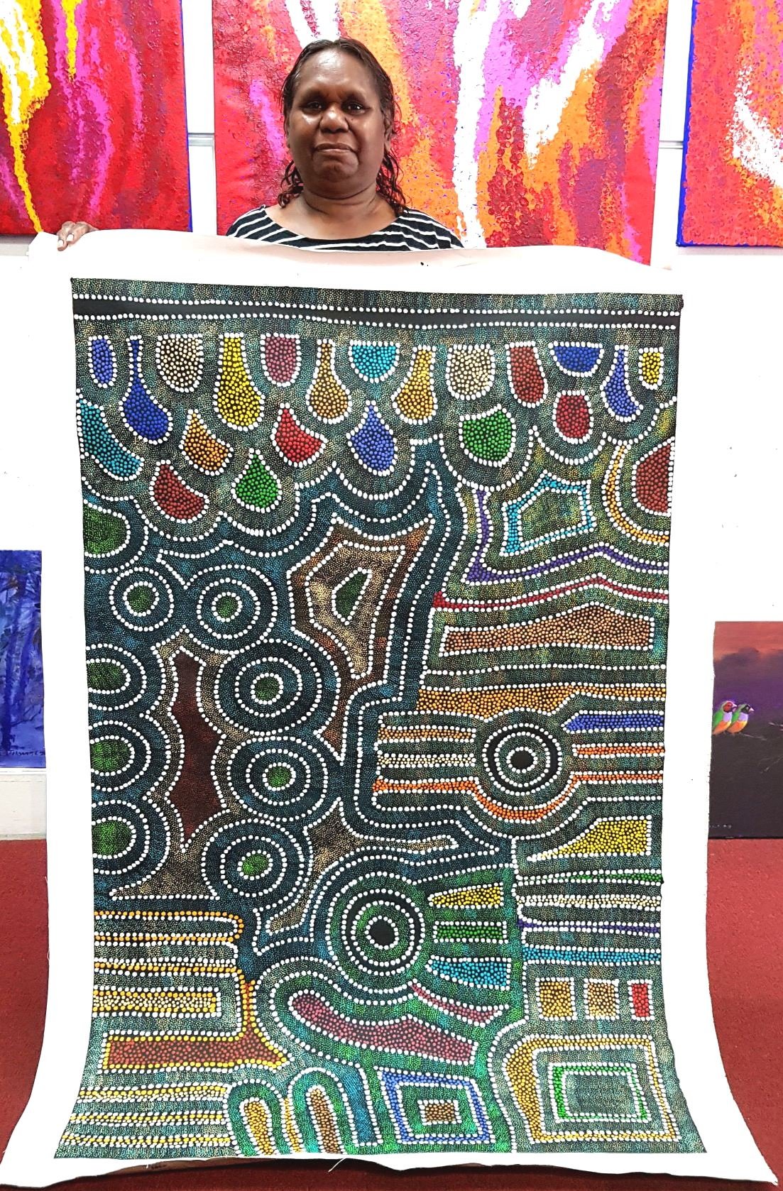 She paints the stories of her heritage, including bush tucker and bush medicine dreaming, mountain devil lizard dreaming, honey ant, emu and kangaroo dreaming in exquisite detail and striking colours.