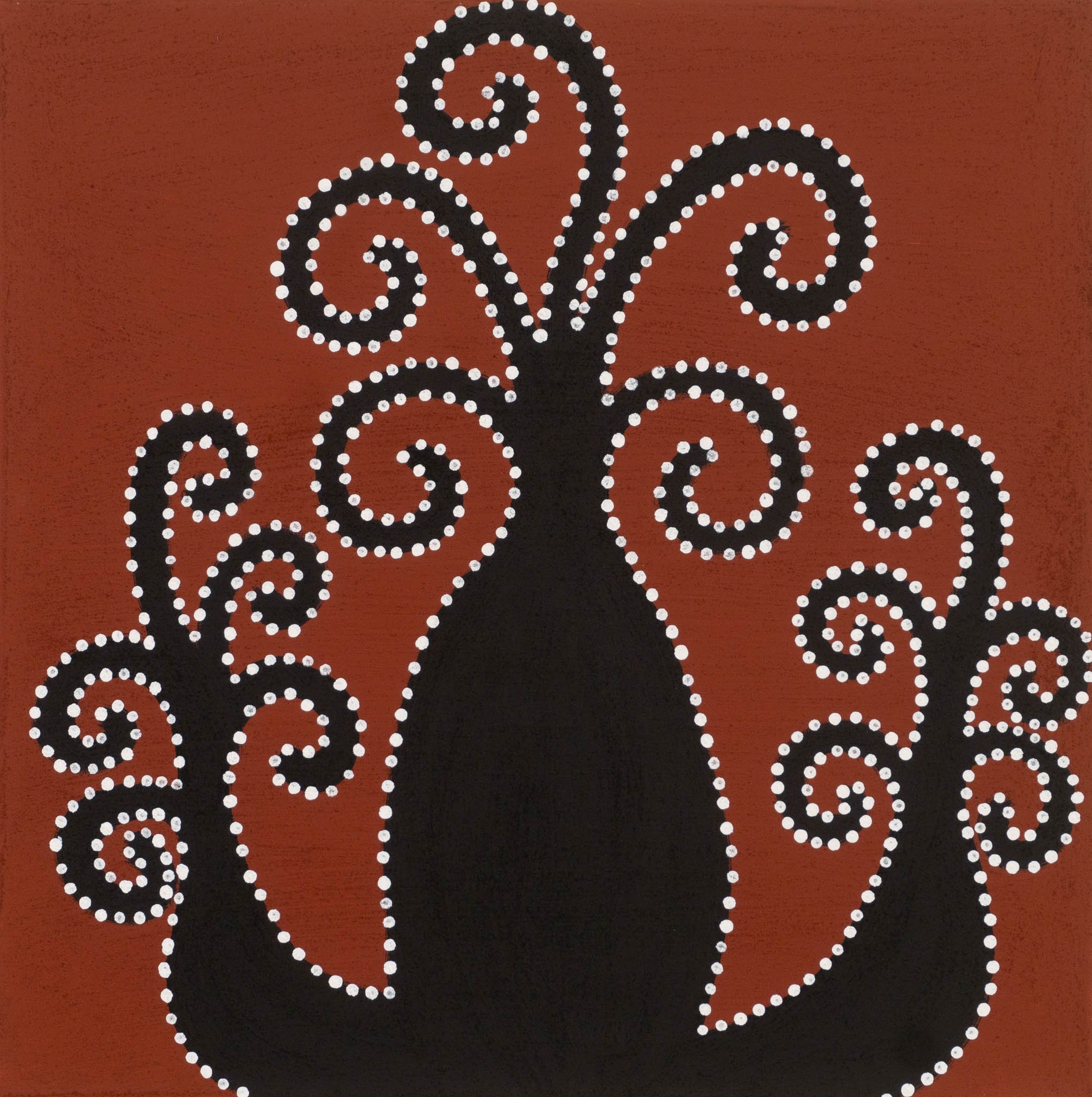I have painted the most important tree in our country – the boab tree. It has been part of our Gija culture forever. Long time ago, the old people named these trees – they all had different names depending on the shape and where they were. In sit down time (holiday time for the station workers) later on, lots of people would meet in the area where a particular tree was, for camping and talking and catching up with family and friends. Still today, we eat the inside of the fruit, both old people and the children as well. It tastes a bit like water chestnuts.