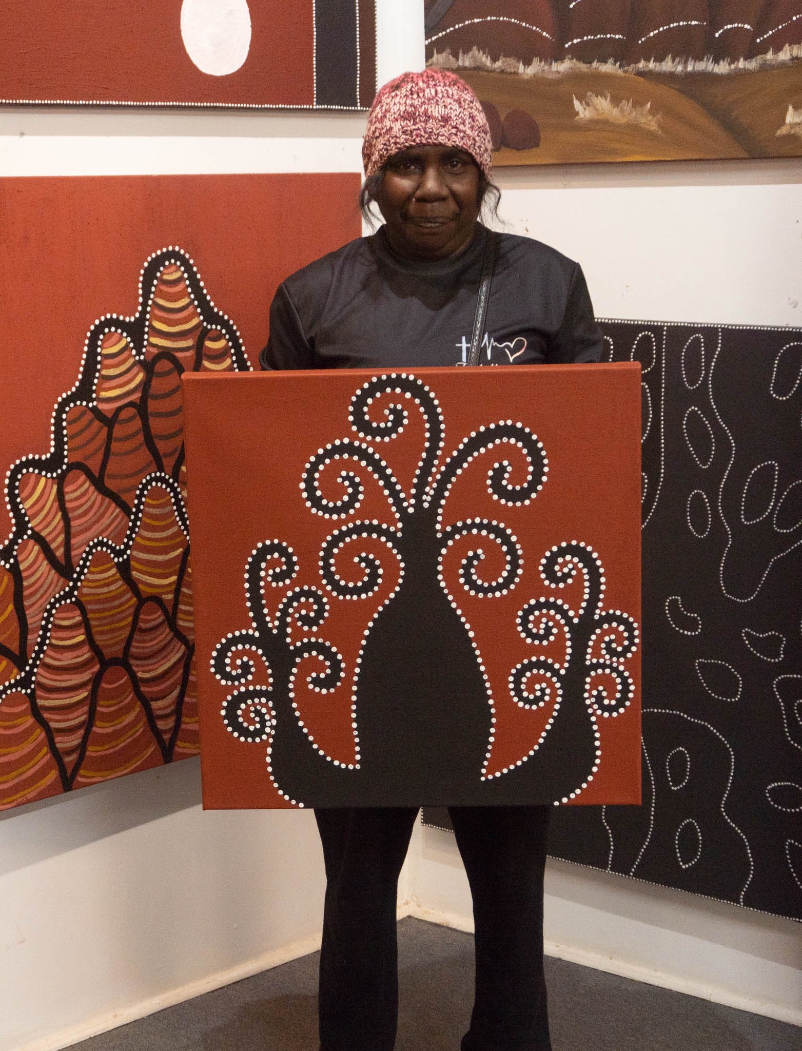 Texas Downs has produced some wonderful artists, and although the subject matter of Charlene’s art is wide and varied, she admits to enjoying most of all the camping trips with her family to their home country of “Texas”, and the paintings she completes of that land, with the Dreaming stories which her “kangayi” (grandmother) Betty Carrington, her Uncle, the late Hector Jandany and her other relatives have taught her.