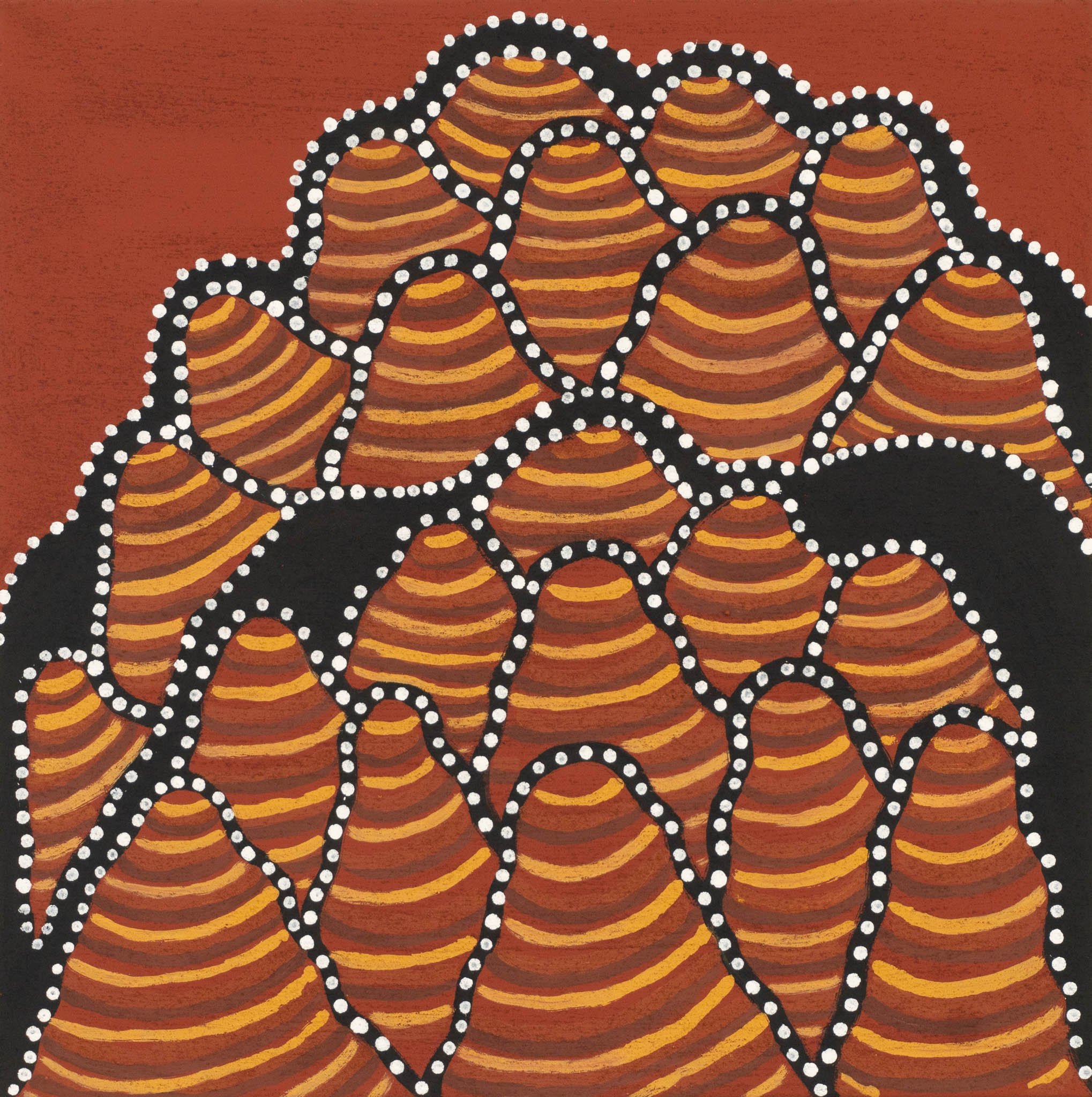 This is Purnululu (the Bungle Bungles) country. The colours of this part of our country change all the time – from pink in the morning, bright red and orange in the hot summer time, brown before the rain, black during the storms and green when the grass grows after the first rain. Every time you go there, it looks different. It’s just like magic – you can paint the same place at a different time of the day or year, and it’s the colours that make it never look the same. This is a very important part of the Kitja country and because it is right next to Texas Downs which is my family’s country, we all paint it. Uncle Jack (Britten) made this place famous with his paintings from the beginning.