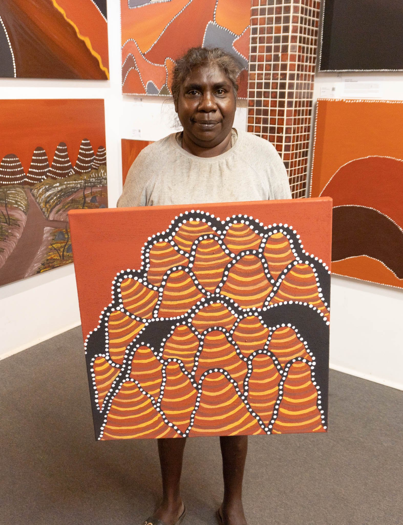 Texas Downs has produced some wonderful artists, and although the subject matter of Charlene’s art is wide and varied, she admits to enjoying most of all the camping trips with her family to their home country of “Texas”, and the paintings she completes of that land, with the Dreaming stories which her “kangayi” (grandmother) Betty Carrington, her Uncle, the late Hector Jandany and her other relatives have taught her.