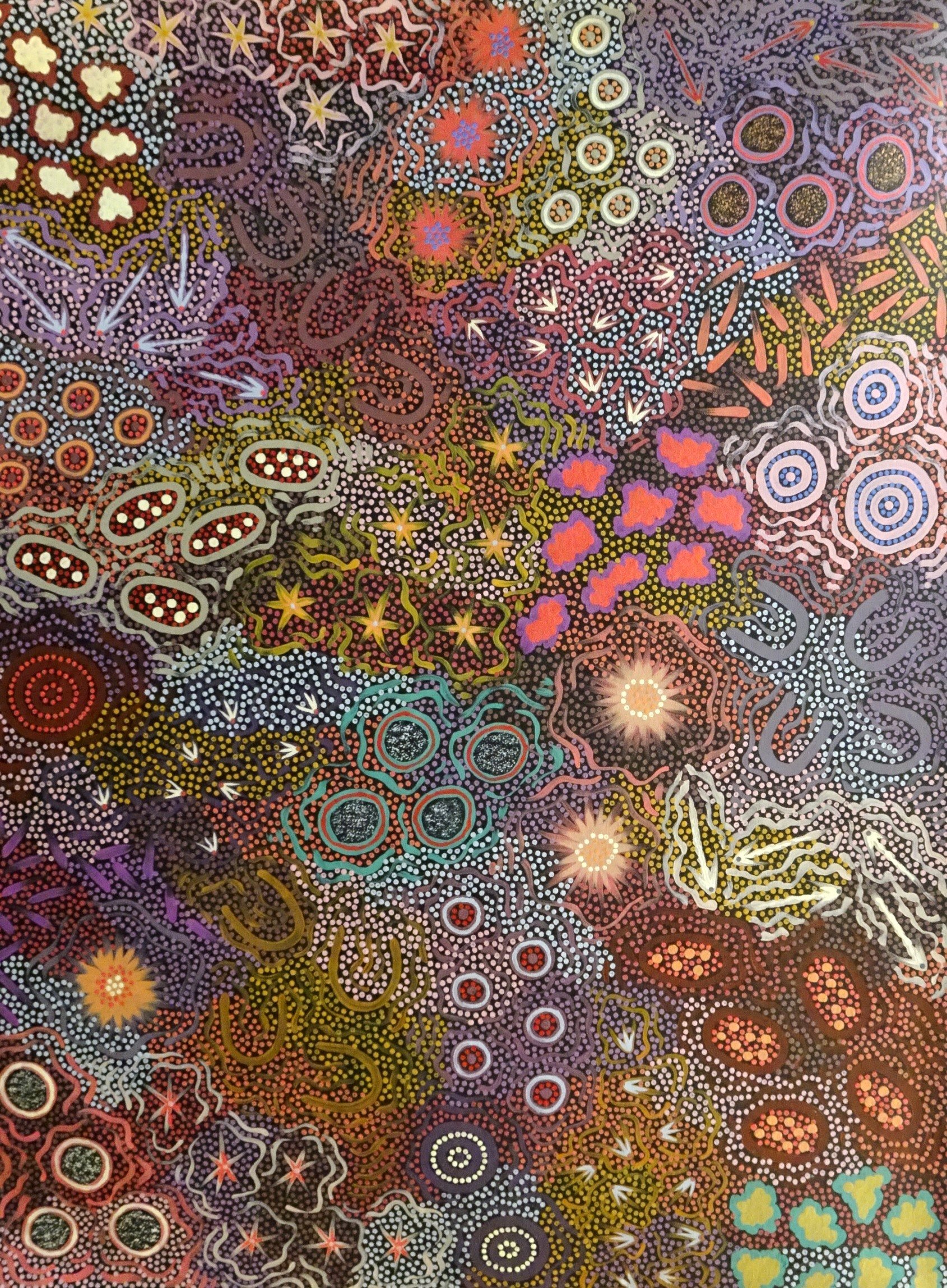 The Women’s Dreaming paintings by Chelsea depicts Women’s ceremonial sites surrounding Tjukurla in the western desert of Central Australia – traditional homelands to the artist’s family. Ceremonial sites carry a deep spiritual meaning and it is where the women narrate their sacred Aboriginal dreamtime stories, through song lines, dance cycles and body paint. This painting has many secret and sacred landmarks and iconography but also includes the important fire, bush tucker and waterholes that are imperative to the women as the ceremonies can last for over a week. Though primarily a landscape painting Chelsea has surpassed the basic stories and landmarks and has expanded this art of body painting and ceremonial themes into a classic contemporary composition, using modern acrylic paints.