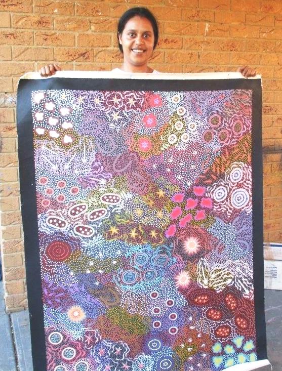 Chelsea learnt to paint by observing and assisting her mother. Her art is colourful and dramatic in style, depicting the dreaming stories and women’s ceremonial activities of her paternal great-grandmother Long Rose Nungala, combined with the bold and precise imaging of her grandfather, aunty and mothers artworks.