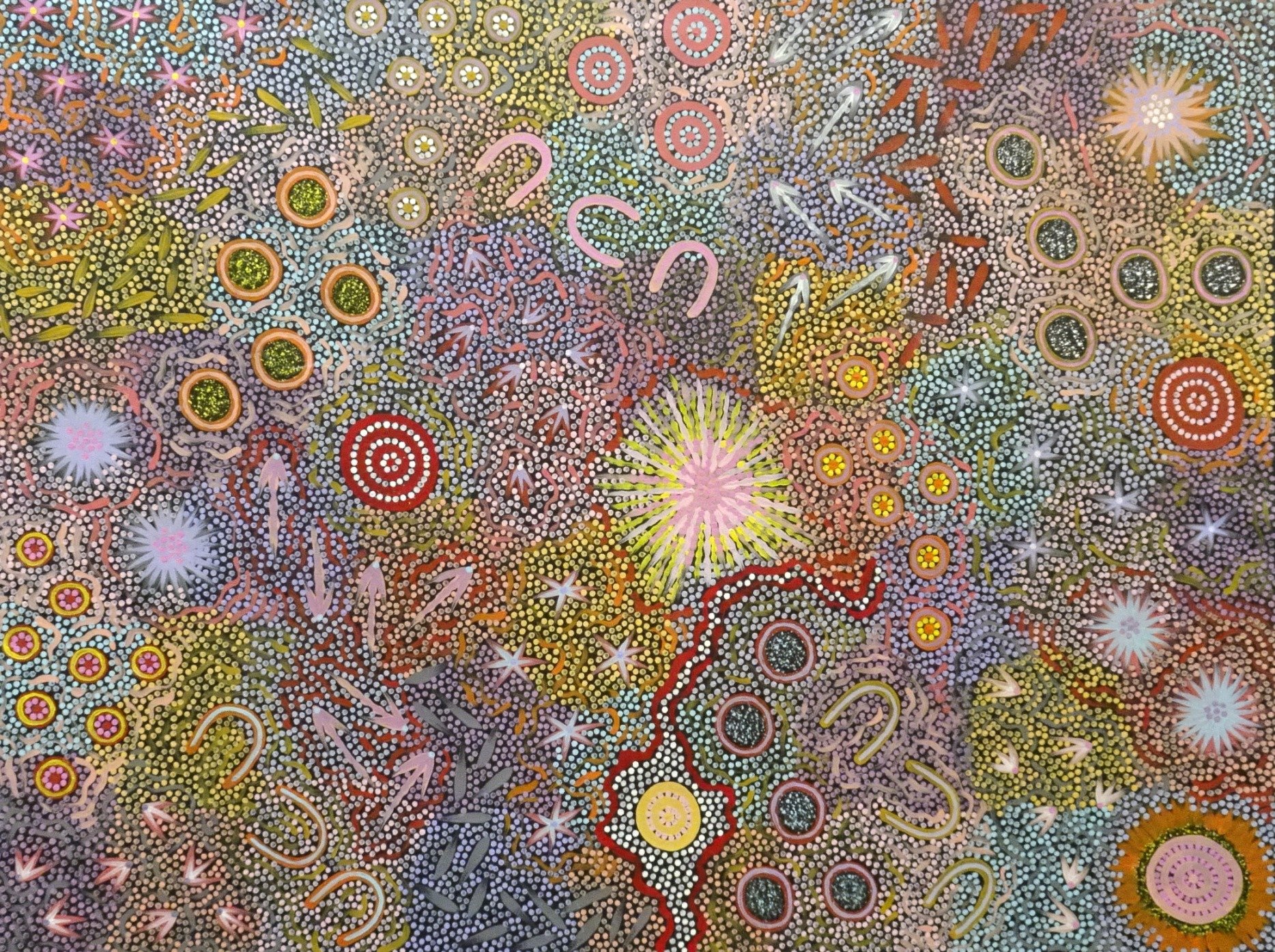 The Women’s Dreaming paintings by Chelsea depicts Women’s ceremonial sites surrounding Tjukurla in the western desert of Central Australia – traditional homelands to the artist’s family. Ceremonial sites carry a deep spiritual meaning and it is where the women narrate their sacred Aboriginal dreamtime stories, through song lines, dance cycles and body paint. This painting has many secret and sacred landmarks and iconography but also includes the important fire, bush tucker and waterholes that are imperative to the women as the ceremonies can last for over a week. Though primarily a landscape painting Chelsea has surpassed the basic stories and landmarks and has expanded this art of body painting and ceremonial themes into a classic contemporary composition, using modern acrylic paints.