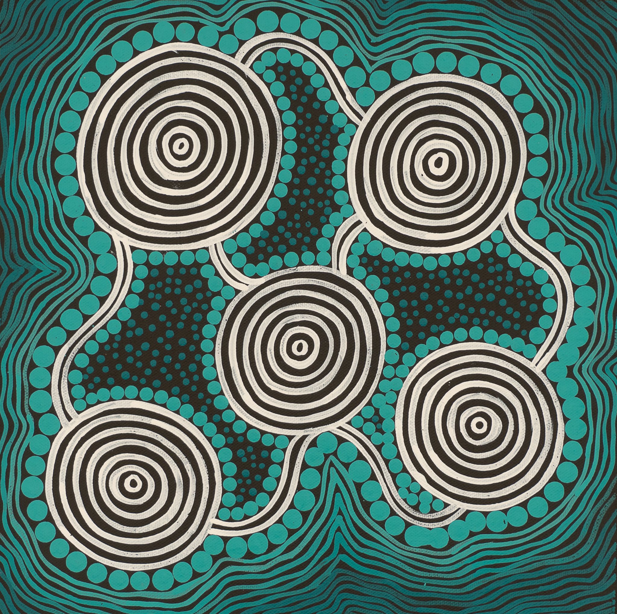 Over the past decade, he has continued learning from them, deepening his cultural knowledge and sharing it through his artworks. In 2015, Davinder left the Northern Territory to continue learning from his cultural teachers on Country in New South Wales. His artworks embody the wisdom passed down by his cultural grandfather and uncles. Through painting, he navigates the modern world, deeply influenced by traditional Ngurrumpa (Dreaming) stories and applying their important lessons in real time.