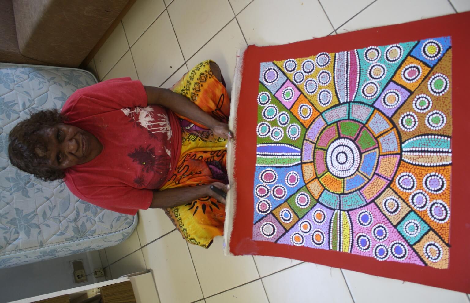 Debra uses vibrant colours to depict a sacred Women’s Dreaming story paints from the ancestral country of her grandfather Shorty Lungkata.