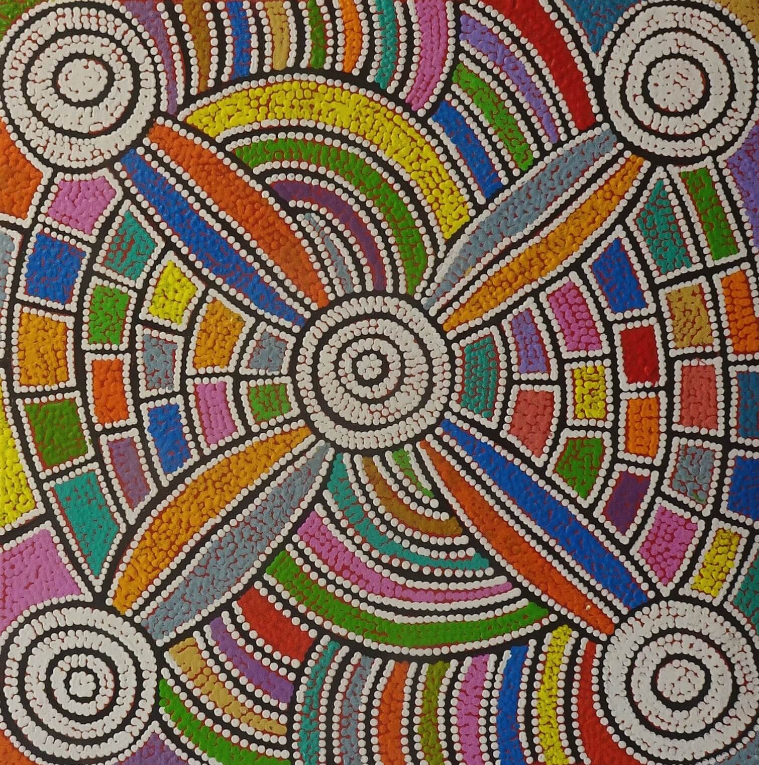 Debra uses vibrant colours to depict a sacred Women’s Dreaming story paints from the ancestral country of her grandfather Shorty Lungkata.