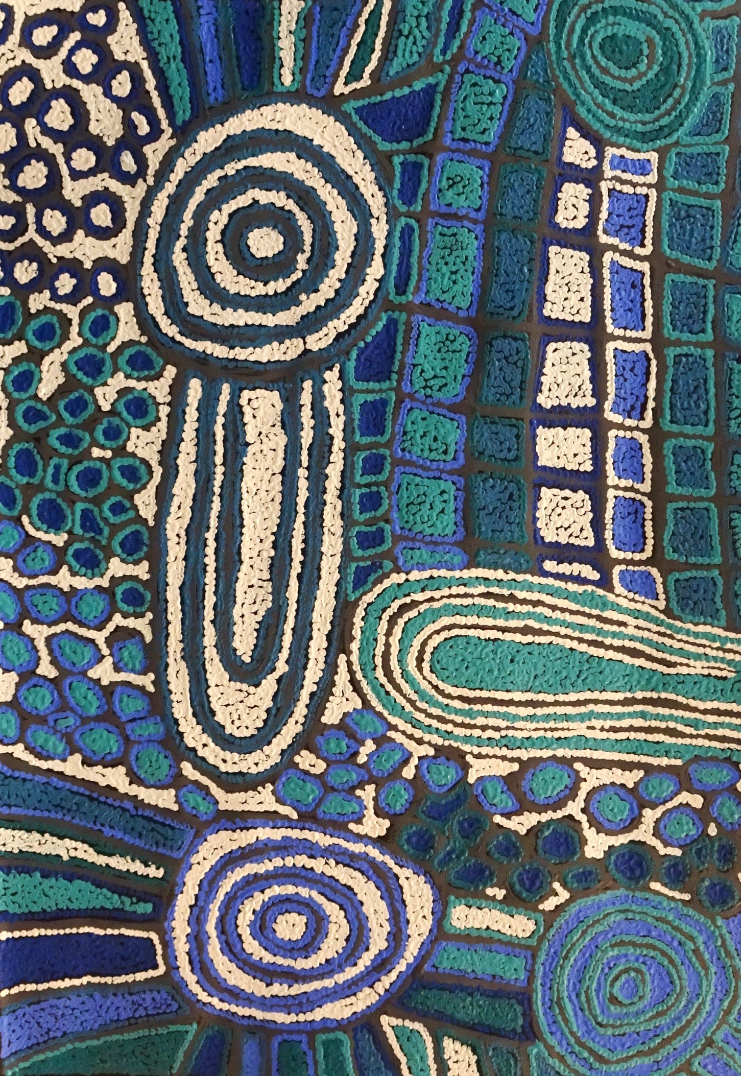 Stunning colours and heavy dot work are used to depict traditional sacred women’s sites in the Kintore area, which is located 250km west of Debra’s birthplace. The concentric circles commonly seen in her paintings represent the important ceremonial sites for Debra and her ancestors and the connecting lines between the circles are the ancient travelling paths that lead to these sites.