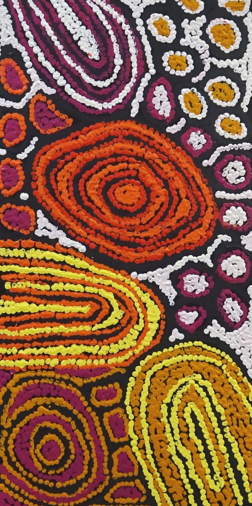 Stunning colours and heavy dot work are used to depict traditional sacred women’s sites in the Kintore area, which is located 250km west of Debra’s birthplace. The concentric circles commonly seen in her paintings represent the important ceremonial sites for Debra and her ancestors and the connecting lines between the circles are the ancient travelling paths that lead to these sites.