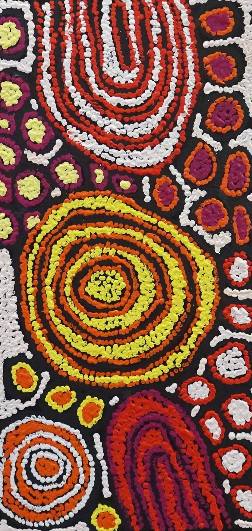 Stunning colours and heavy dot work are used to depict traditional sacred women’s sites in the Kintore area, which is located 250km west of Debra’s birthplace. The concentric circles commonly seen in her paintings represent the important ceremonial sites for Debra and her ancestors and the connecting lines between the circles are the ancient travelling paths that lead to these sites.