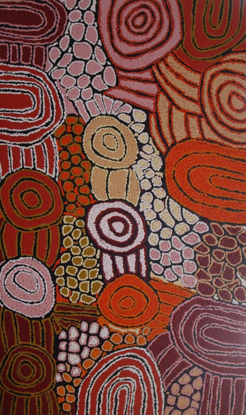 Similarities can be seen between Debra’s work and the bold style of the Papunya Tula movement. This is especially evident in the way the paint is applied in thick, joined dots. Debra has developed her own palette of colours and her personal way of representing the iconography to depict the traditional sacred women’s sites in the Kintore area, located 250km west of her birthplace.