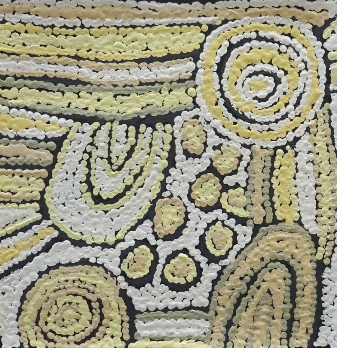 Similarities can be seen between Debra’s work and the bold style of the Papunya Tula movement. This is especially evident in the way the paint is applied in thick, joined dots. Debra has developed her own palette of colours and her personal way of representing the iconography to depict the traditional sacred women’s sites in the Kintore area, located 250km west of her birthplace.