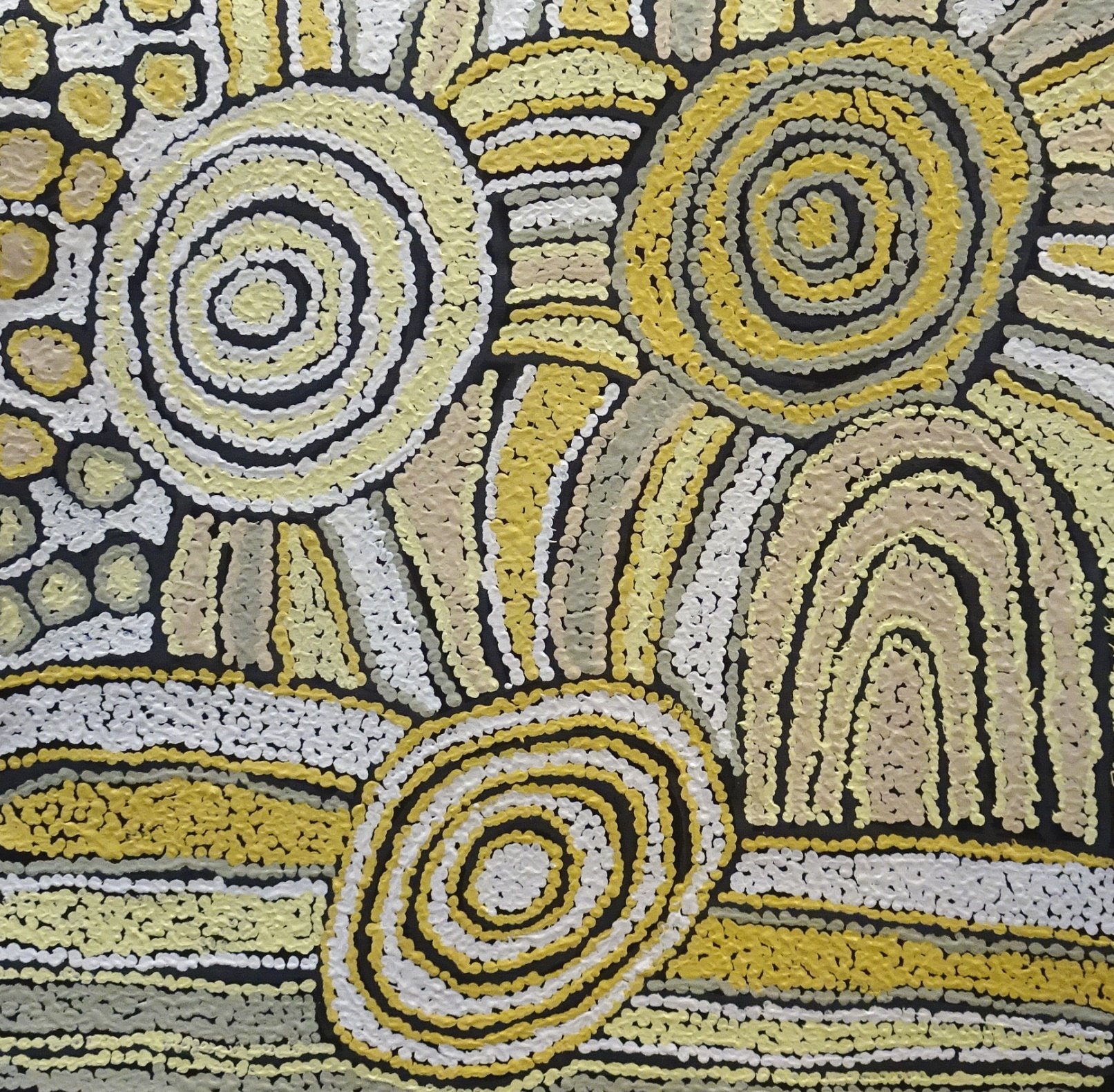 Stunning colours and heavy dot work are used to depict traditional sacred women’s sites in the Kintore area, which is located 250km west of Debra’s birthplace. The concentric circles commonly seen in her paintings represent the important ceremonial sites for Debra and her ancestors and the connecting lines between the circles are the ancient travelling paths that lead to these sites.