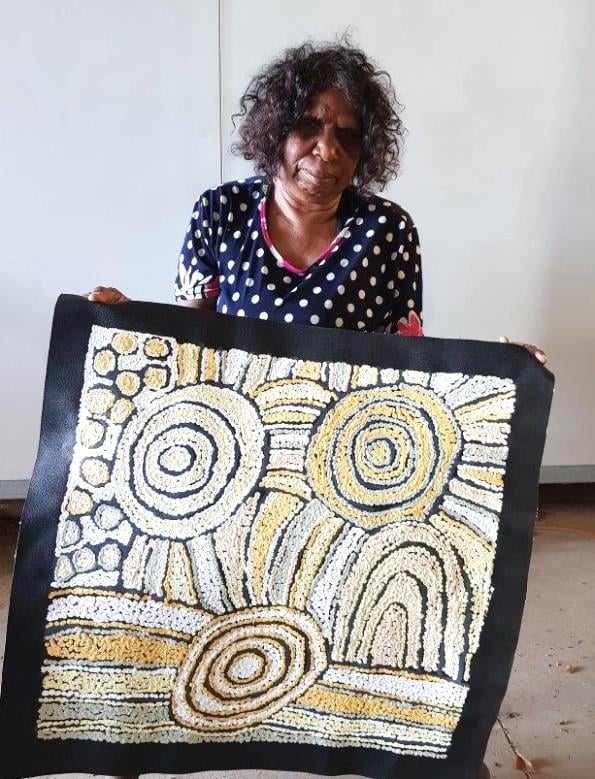 Debra’s father, Johnny Yungut Tjupurrula, was also a successful Papunya Tula artist, as were her mother’s sister, Pirrmangka Napanangka, and her grandmother, Inyuwa Nampitjinpa.