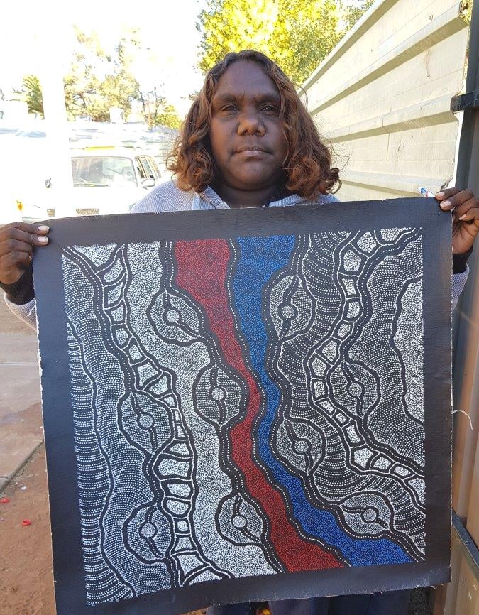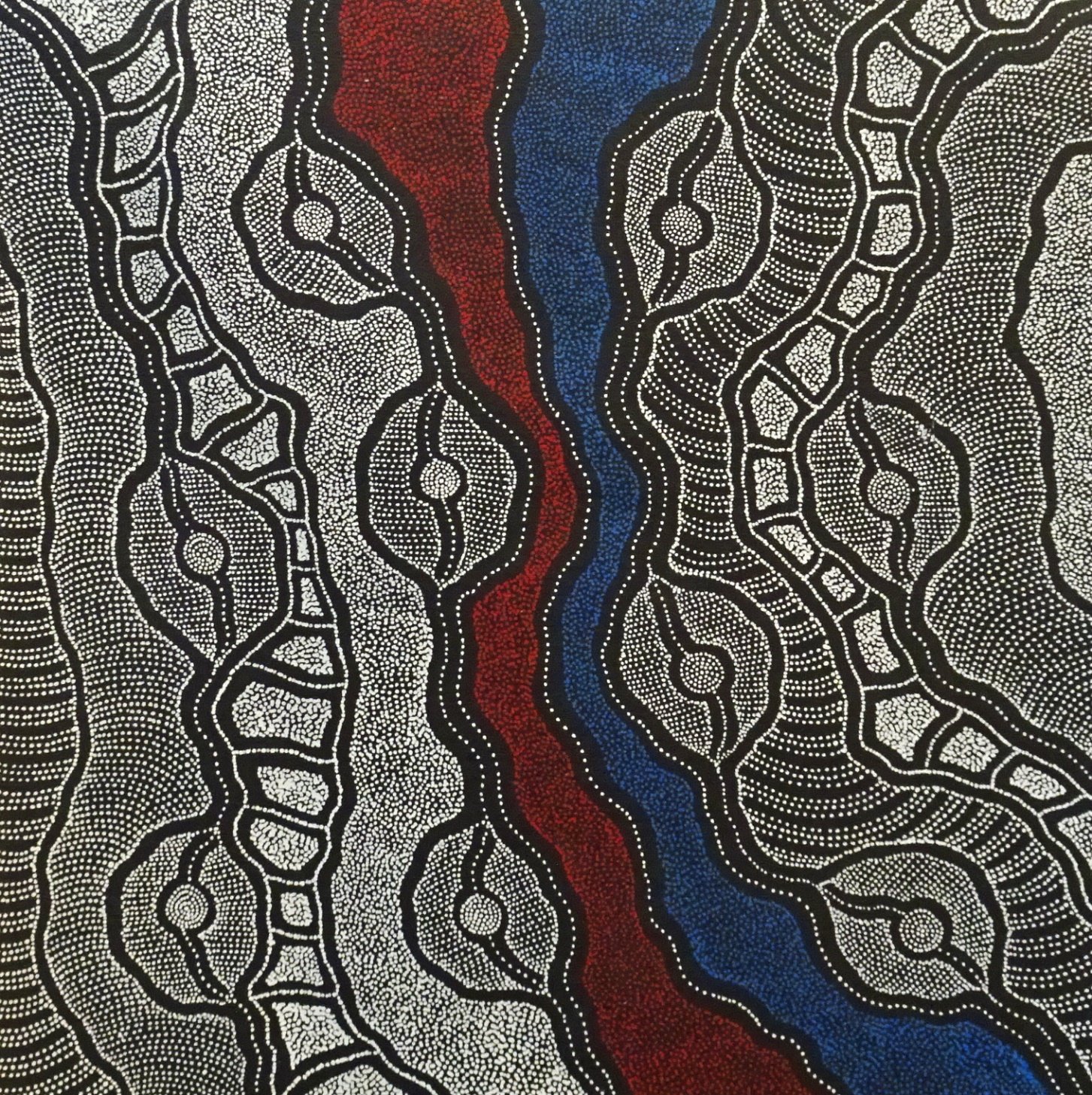 Delvine’s artwork depicts from a topographical view in fine detail, multi layered elements associated with her family homelands of Atneltyeye, Utopia in Central Australia. The illustration is important visually and spiritually of country – sand hills, river beds, and significant landmarks for ceremonies. The leaves, flowers, bark or seeds of certain plants are harvested in season or as needed. This is often done in groups so that knowledge is passed down from older to younger women. Ceremonial sites are where the women gather for girls’ initiation and other cultural Law matters. The women sit around the waterholes, often depicted in the artwork, with the waterholes being full in the dry desert land. Due to this, there was plenty of bush tucker around for the women to eat during the sometimes very long period of time they camped out for Women’s Business.