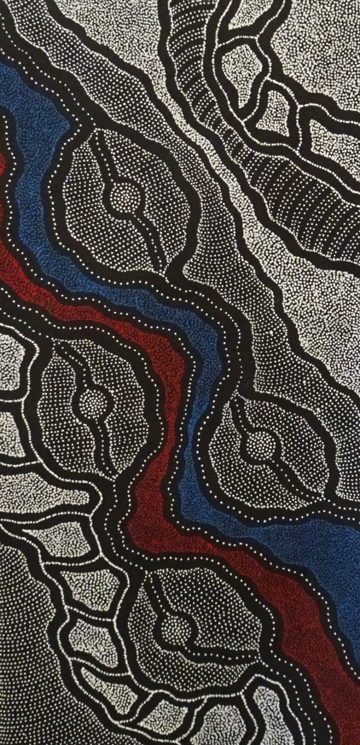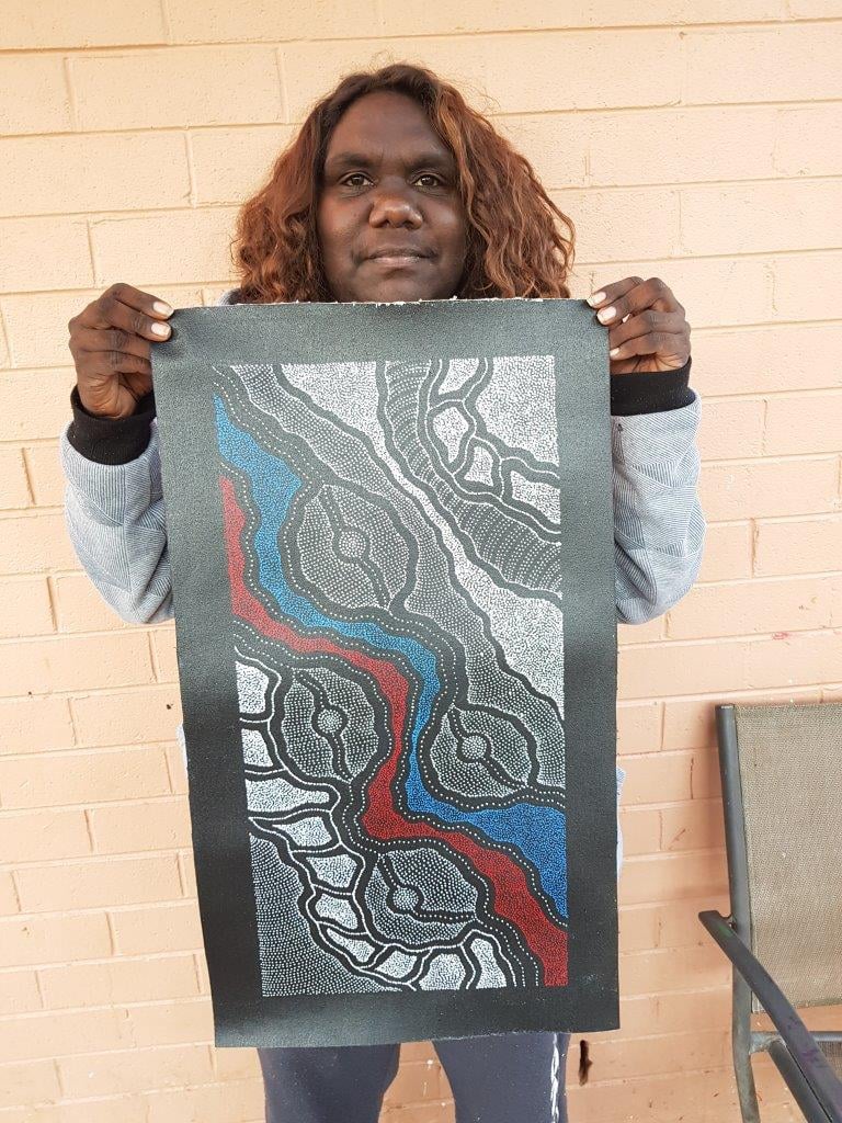 Delvine’s artwork depicts from a topographical view in fine detail, multi layered elements associated with her family homelands of Atneltyeye, Utopia in Central Australia. The illustration is important visually and spiritually of country – sand hills, river beds, and significant landmarks for ceremonies. The leaves, flowers, bark or seeds of certain plants are harvested in season or as needed. This is often done in groups so that knowledge is passed down from older to younger women. Ceremonial sites are where the women gather for girls’ initiation and other cultural Law matters. The women sit around the waterholes, often depicted in the artwork, with the waterholes being full in the dry desert land. Due to this, there was plenty of bush tucker around for the women to eat during the sometimes very long period of time they camped out for Women’s Business.