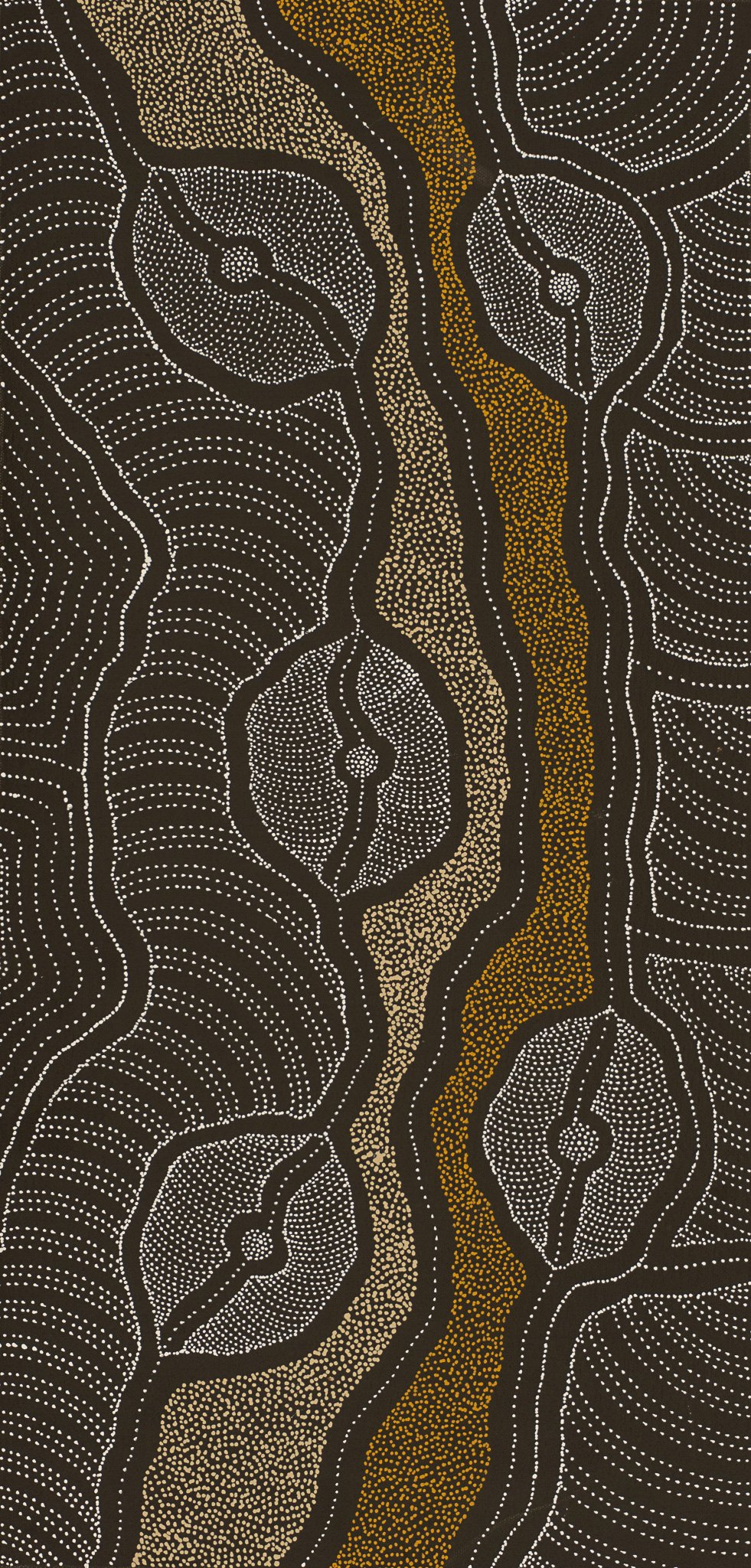 Delvine’s artwork depicts from a topographical view in fine detail, multi layered elements associated with her family homelands of Atneltyeye, Utopia in Central Australia. The illustration is important visually and spiritually of country – sand hills, river beds, and significant landmarks for ceremonies. The leaves, flowers, bark or seeds of certain plants are harvested in season or as needed. This is often done in groups so that knowledge is passed down from older to younger women. Ceremonial sites are where the women gather for girls’ initiation and other cultural Law matters. The women sit around the waterholes, often depicted in the artwork, with the waterholes being full in the dry desert land. Due to this, there was plenty of bush tucker around for the women to eat during the sometimes very long period of time they camped out for Women’s Business.