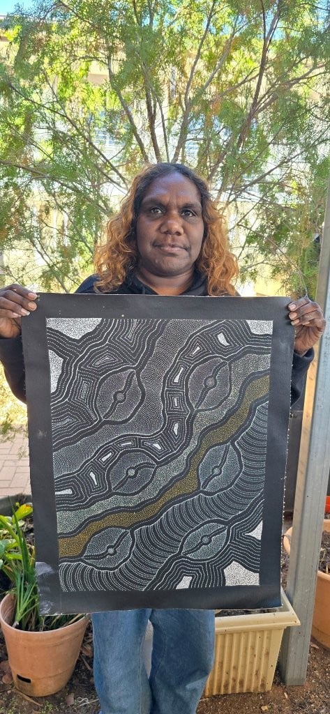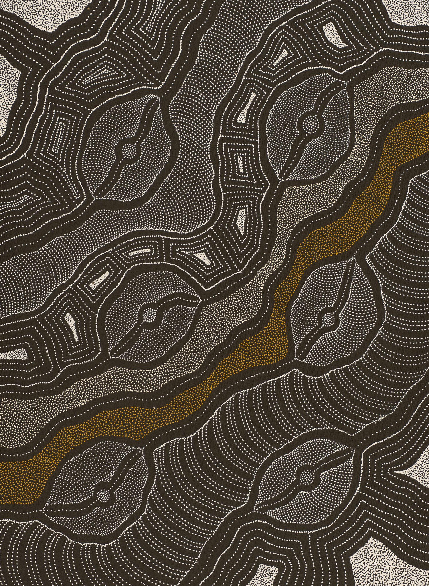 Delvine’s artwork depicts from a topographical view in fine detail, multi layered elements associated with her family homelands of Atneltyeye, Utopia in Central Australia. The illustration is important visually and spiritually of country – sand hills, river beds, and significant landmarks for ceremonies. The leaves, flowers, bark or seeds of certain plants are harvested in season or as needed. This is often done in groups so that knowledge is passed down from older to younger women. Ceremonial sites are where the women gather for girls’ initiation and other cultural Law matters. The women sit around the waterholes, often depicted in the artwork, with the waterholes being full in the dry desert land. Due to this, there was plenty of bush tucker around for the women to eat during the sometimes very long period of time they camped out for Women’s Business.