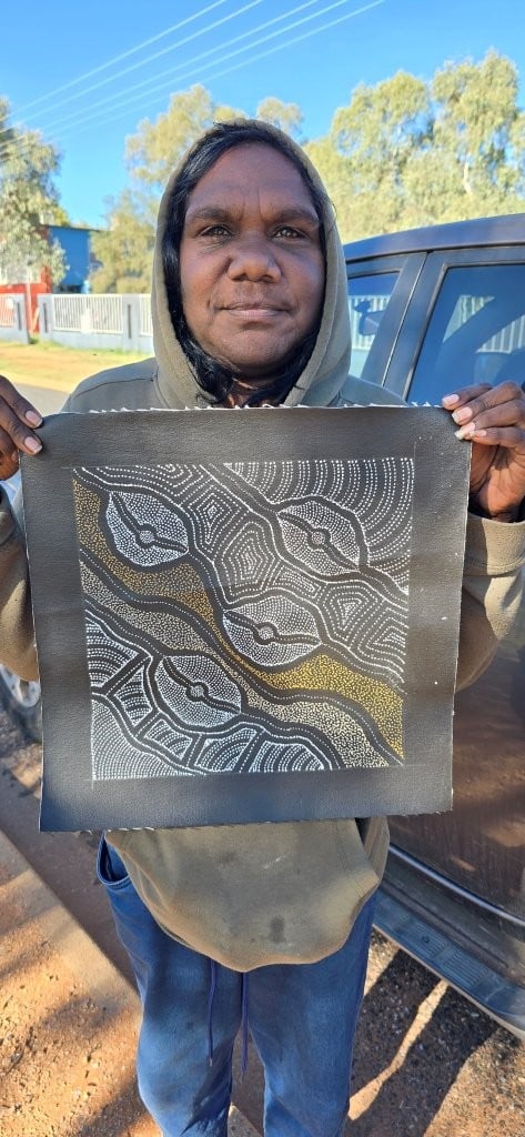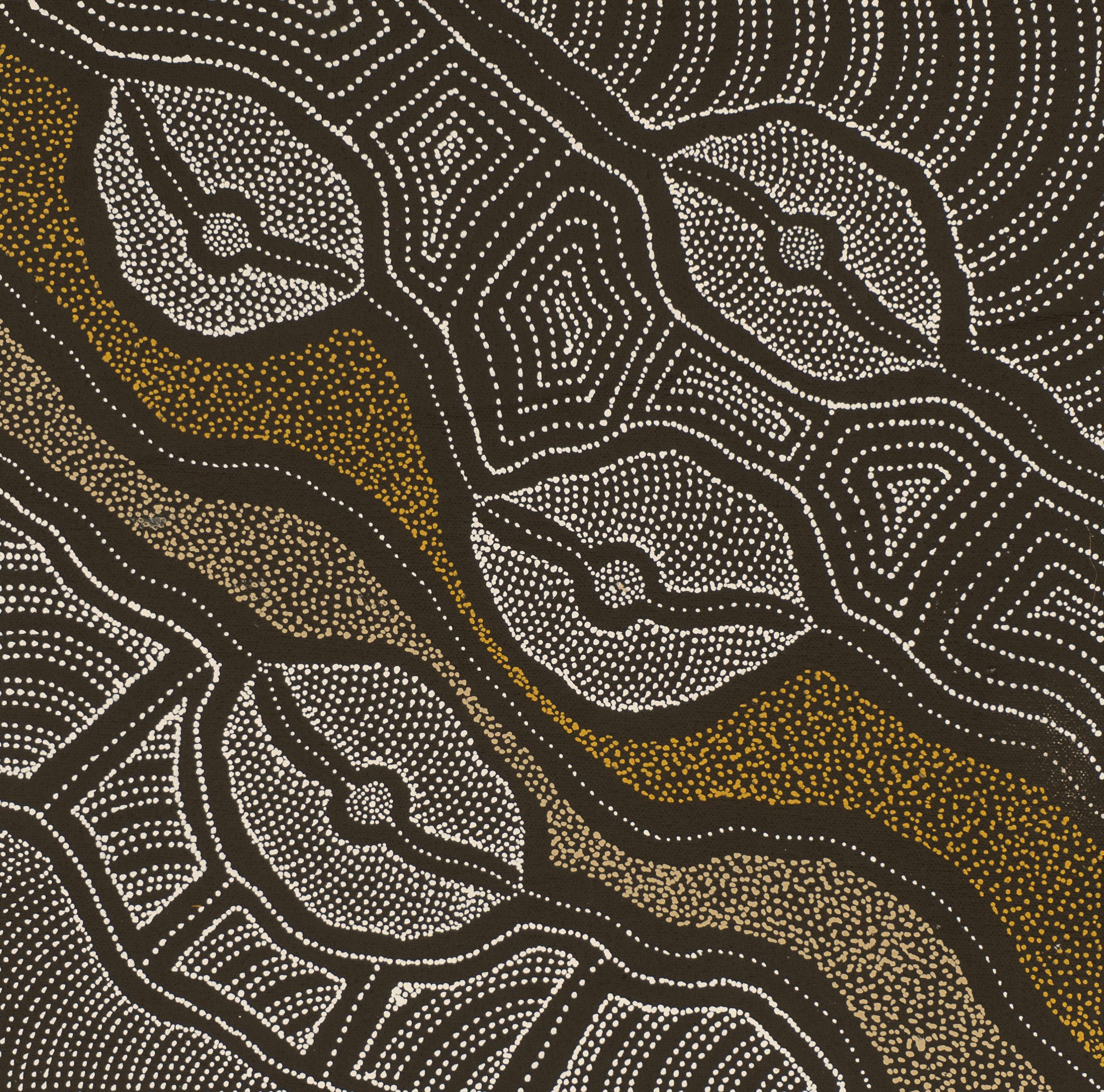 This is often done in groups so that knowledge is passed down from older to younger women. Ceremonial sites are where the women gather for girls’ initiation and other cultural Law matters. The women sit around the waterholes, often depicted in the artwork, with the waterholes being full in the dry desert land. Due to this, there was plenty of bush tucker around for the women to eat during the sometimes very long period of time they camped out for Women’s Business.