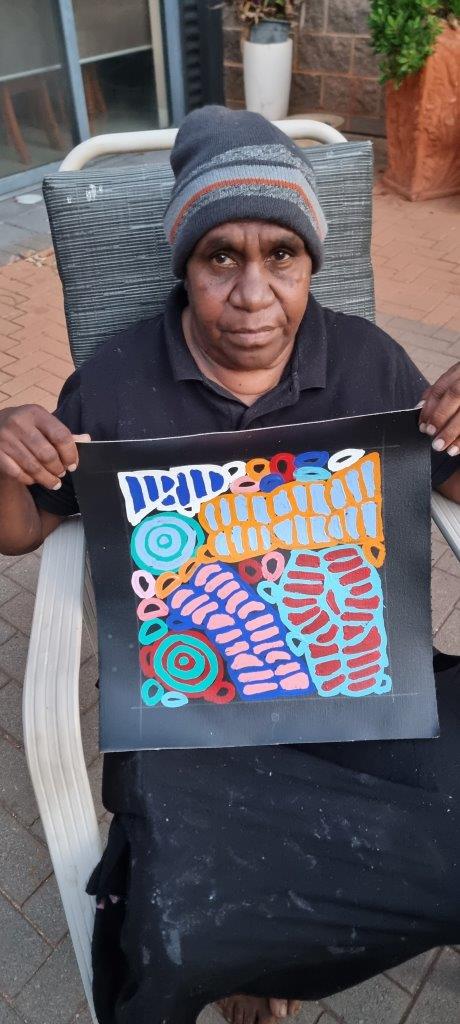 Dora paints the Body Paint (Awleye) designs, coupled with the small roundels of bush melons and large roundels (soakages) made famous by her mother, but stamping the artworks as her own with flair and recognisable signature strong brush strokes.