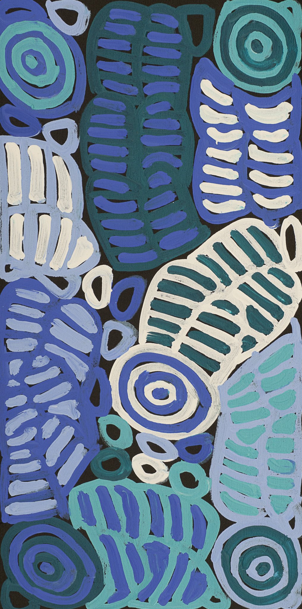 Dora has four children and resides in Alice Springs, returning to her homelands of Atnwengerrp with her family often. A quiet, traditional lady who continues to pay homage to her heritage by depicting the bush tucker, ceremonial body paint and water sources in her country.