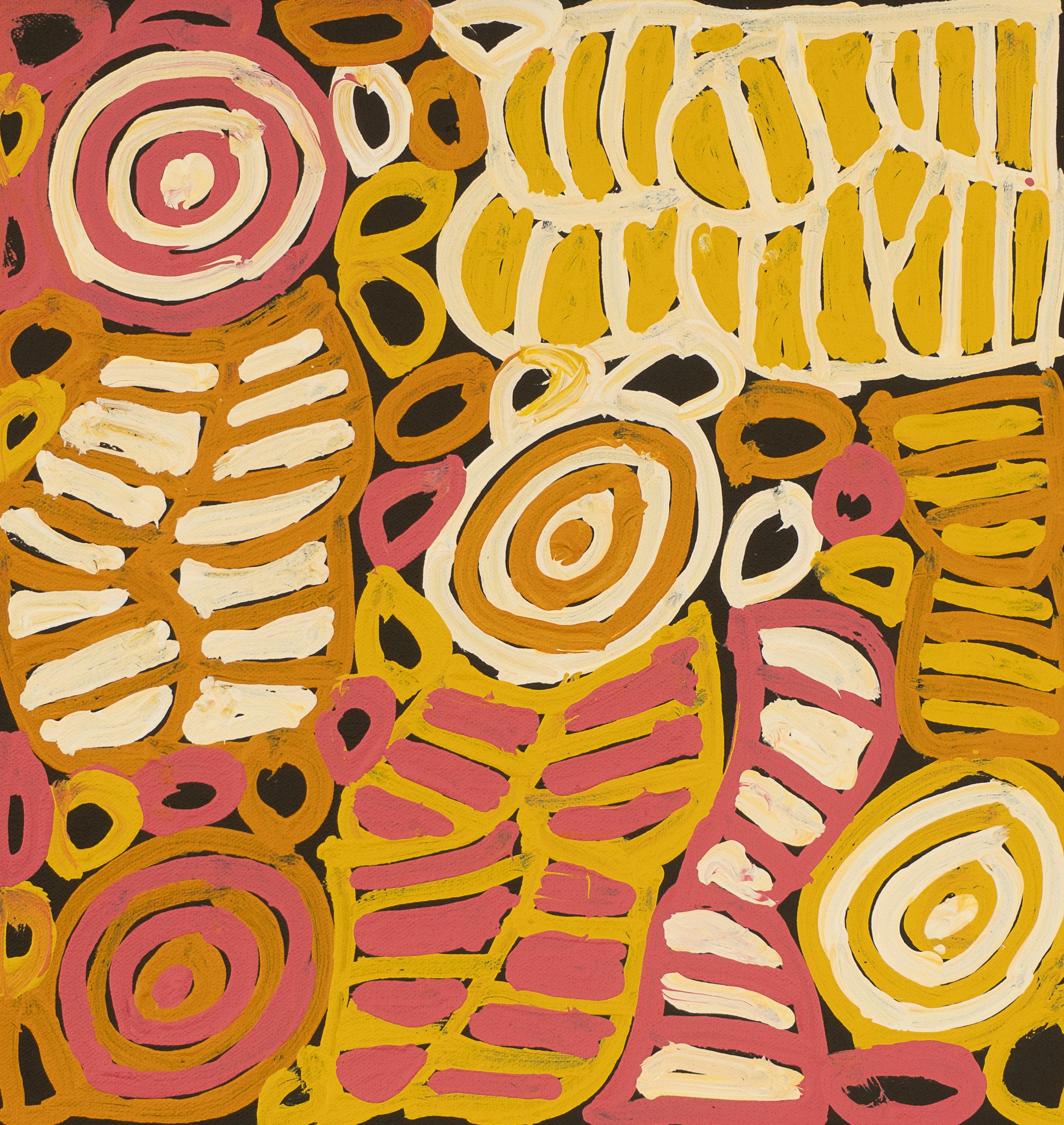 Though Dora enjoys using lots of different colours in her paintings, the traditional colours used during ceremony for her dreaming stories from Atnwengerrp country are red and white. Atnwengerrp lies in the heartland of Alyawarr country, approx. 200 kilometres to the north-east of Alice Springs.