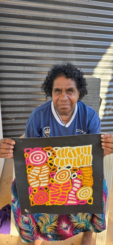 Dora paints the Body Paint (Awleye) designs, coupled with the small roundels of bush melons and large roundels (soakages) made famous by her mother, but stamping the artworks as her own with flair and recognisable signature strong brush strokes.