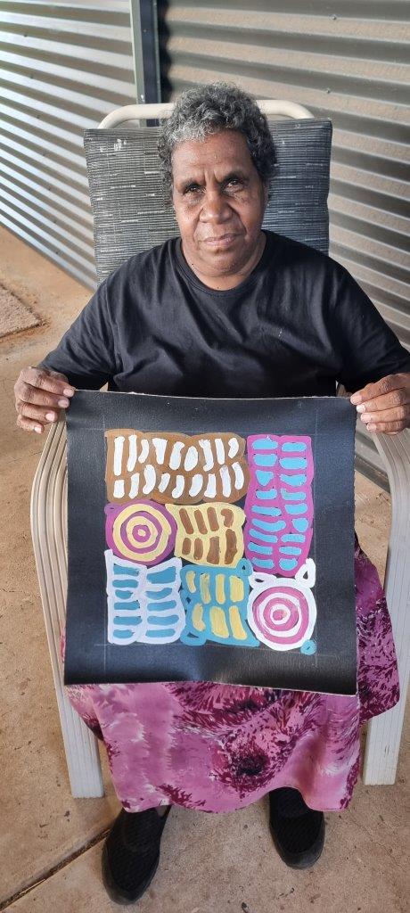 Dora paints the Body Paint (Awleye) designs, coupled with the small roundels of bush melons and large roundels (soakages) made famous by her mother, but stamping the artworks as her own with flair and recognisable signature strong brush strokes.