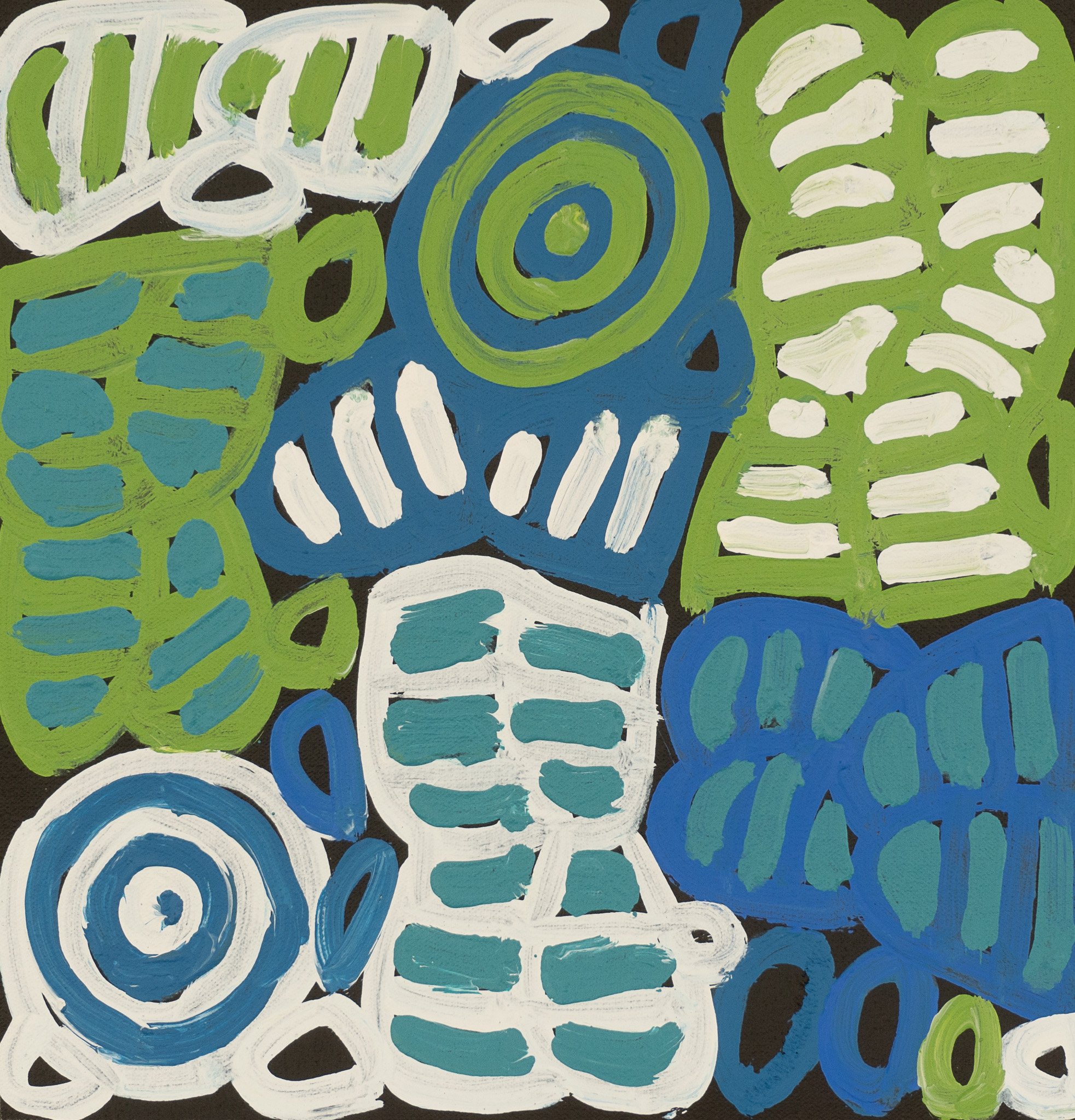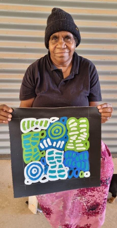 Dora paints the Body Paint (Awleye) designs, coupled with the small roundels of bush melons and large roundels (soakages) made famous by her mother, but stamping the artworks as her own with flair and recognisable signature strong brush strokes.