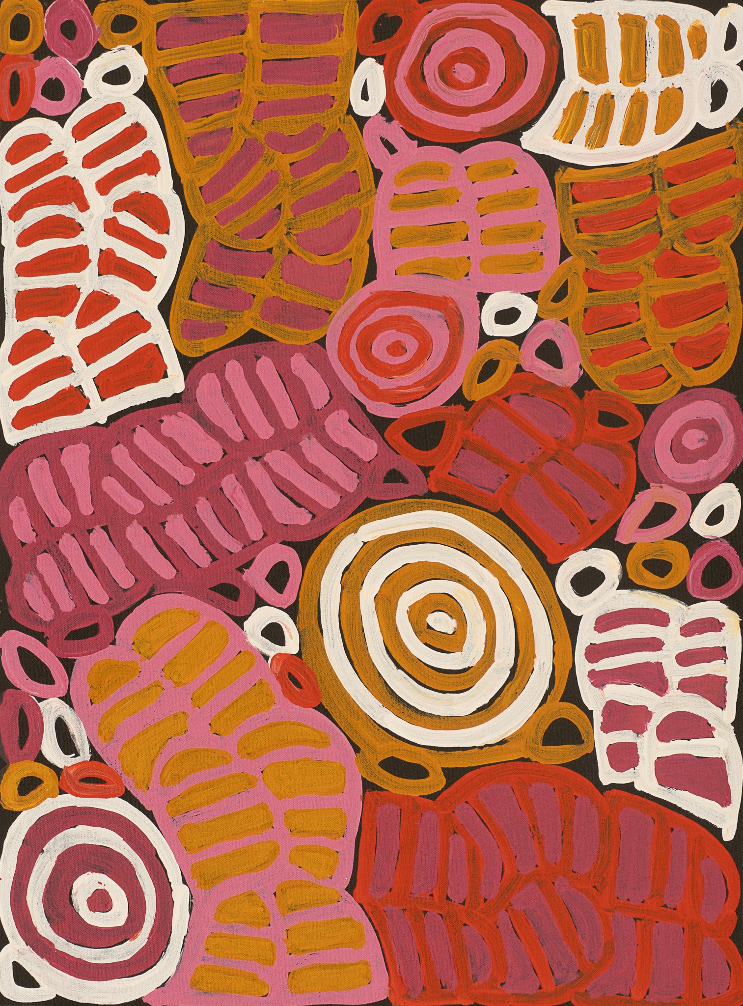 Though Dora enjoys using lots of different colours in her paintings, the traditional colours used during ceremony for her dreaming stories from Atnwengerrp country are red and white. Atnwengerrp lies in the heartland of Alyawarr country, approx. 200 kilometres to the north-east of Alice Springs.